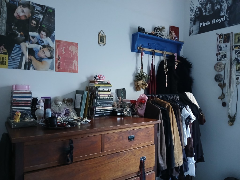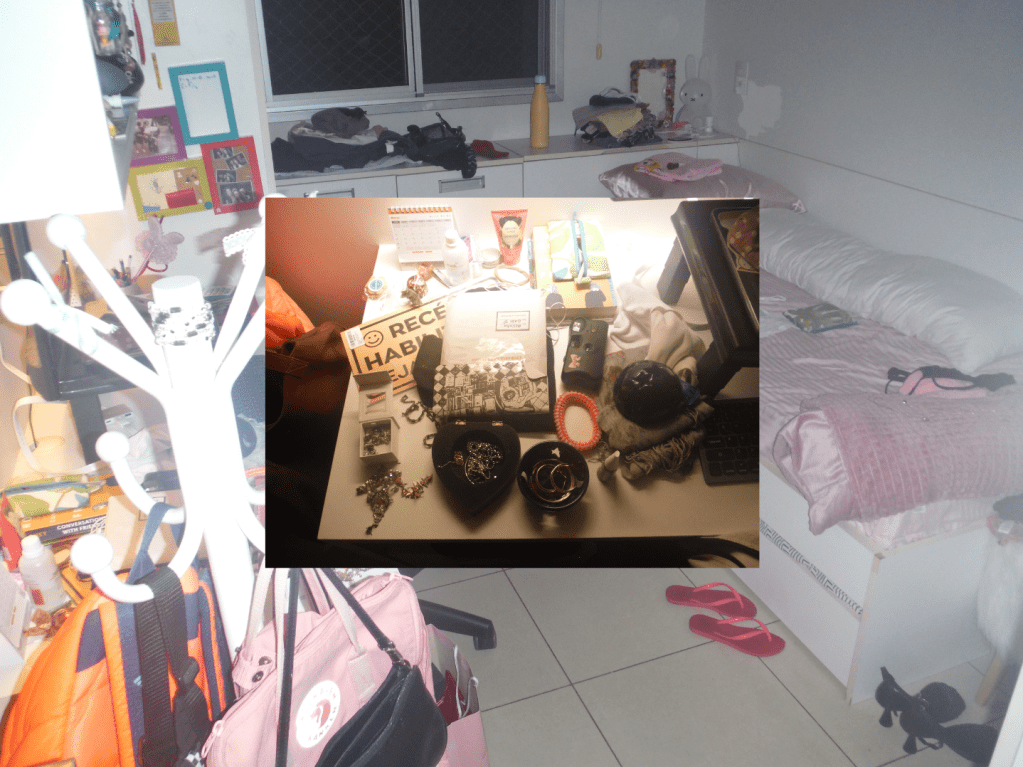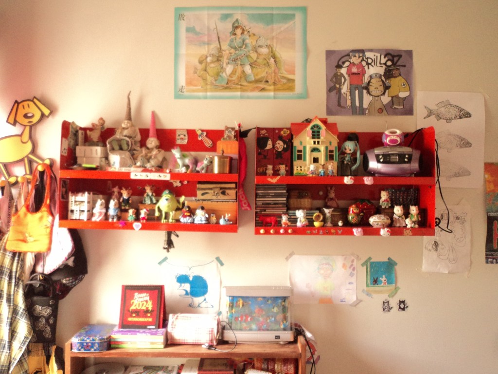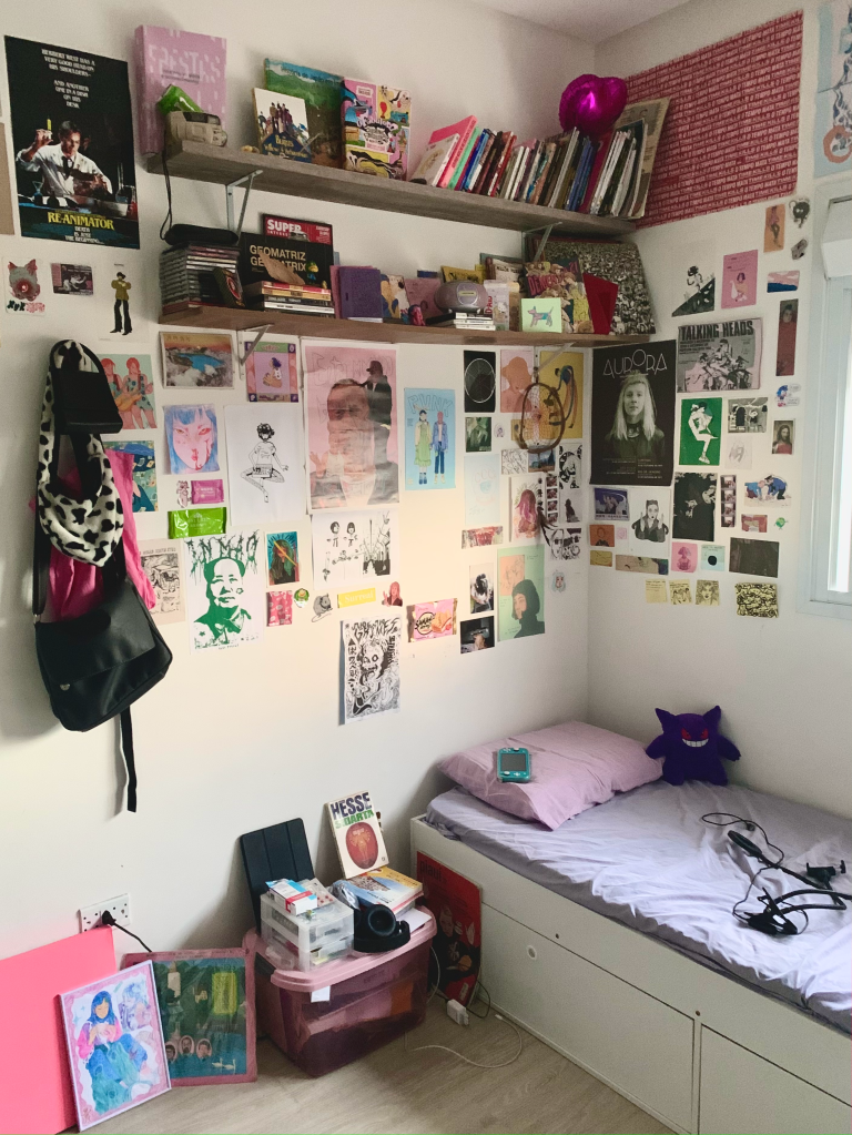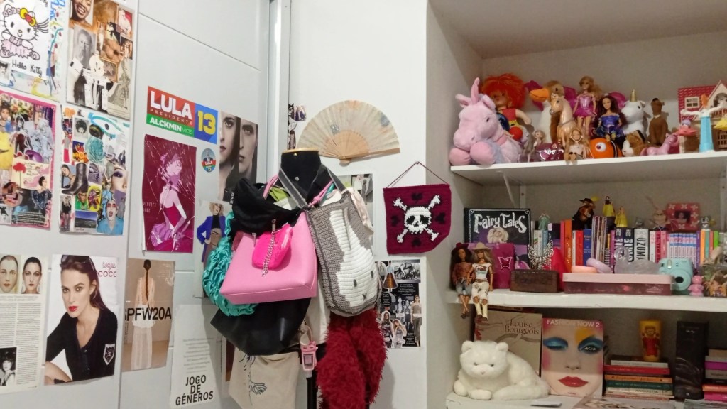 meu quartinho no animal crossing é o lugar mais confortável que já encontrei e construí em um videogame. é muito especial o som que o piso faz quando piso nele, a iluminação, minha luminária de cereja, minha cama de concha, os bichos de pelúcia e a mesinha do cinnamoroll… uma nova adição mas já muito querida e que incorporou muito bem a todo cenário. te amo animal crossing, te amo. – lua arimura, @meirallua esse cantinho do meu quarto é muito especial pra mim porque ele compila várias memórias em formato de objetos. tem brinquedos da minha infância, minha coleção humilde de CDs e o meu radinho pra tocá-los, presentes de pessoas que eu amo, caixinhas grandes e pequenas guardando cacarecos importantes pra mim, coisas que eu herdei das minhas avós,… tem de tudo. É um retrato do meu coração. melhor ainda do que guardar uma coisa especial é guardar ela à mostra em um lugar bem visível pra mim mesma né? meu quarto é um museu e essas estantes são a galeria mais especial da exposição <3. – sofia mergener, @sofialentilhaquando minha mesa tá organizada, o resto do quarto automaticamente também fica arrumado. essa escrivaninha era da minha vovó, e esse abajur foi comprado num brechó por R$30 (com +30 camadas de poeira inclusas), e ele fica sobre um doily de crochê feito por essa mesma vovó. ninguém realmente precisa olhar dentro das gavetas. mas aqui é meu cafofo e eu amo fechar as cortinas e deixar a luz amarela iluminar meu cantinho. – jéssica, @je062803meu quartinho é um reflexo da minha mente! coleções, pôsteres, bibelôs empoeirados, flores mortas, hello kittys, tudo isso é matéria prima do meu quarto. Me inspiro no vintage e nos anos 60, mas também na modernidade da década de 90. gosto de terços, livros, todo tipo de enfeite e decoração, coisinhas fofas, mas também mórbidas como ossos e dentes. as bonecas são originais vintage e italianas, eram da minha vó! meu quarto está sempre bagunçado (minha bagunça é no estilo de sofia coppola) mas também amo arruma-lo e deixa-lo cheirosinho. meu quarto é meu coração, cabeça e alma. centro do meu ser. – bruna, @grotesquelady