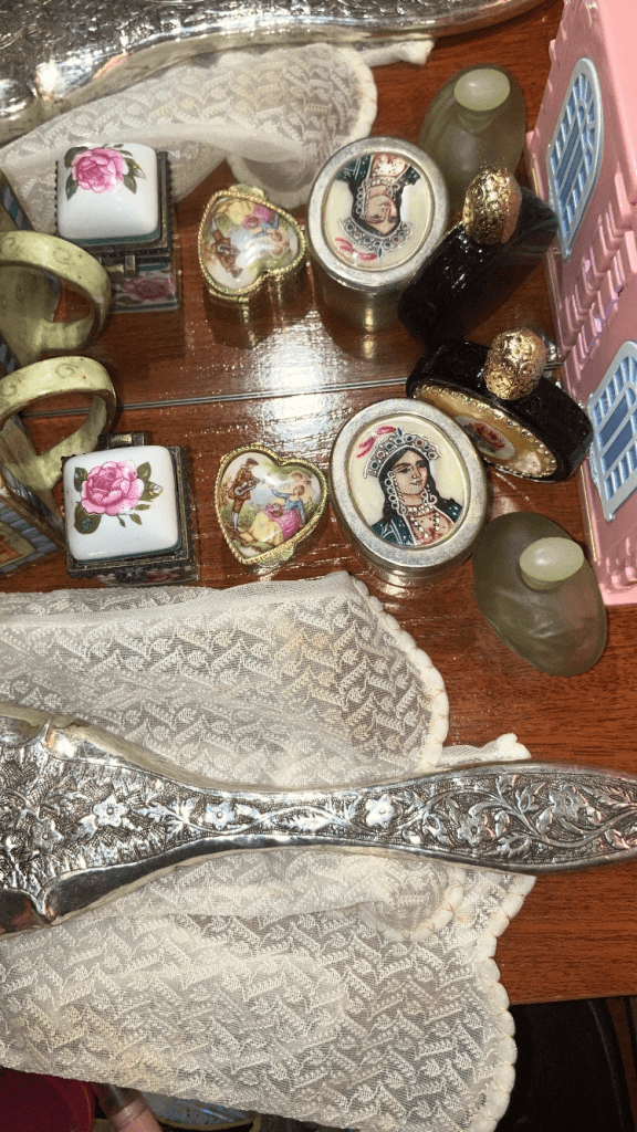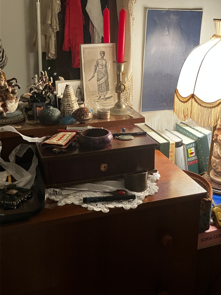 essa é minha penteadeira do quarto que eu moro há alguns meses. eu acho que retrata bem a importância que eu dou em juntar bugigangas e construir um armazém pra me receber depois do dia. esse quarto foi se formando de forma muito rápida por que eu precisei muito dele.