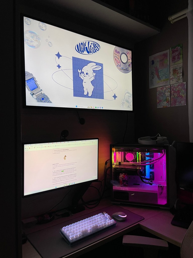 Eu gosto muito do escuro também, porque sinto um desconforto com a luz central do quarto por ela ser forte, mas quando são só as luzes das telas eu me sinto mais no meu mundinho.