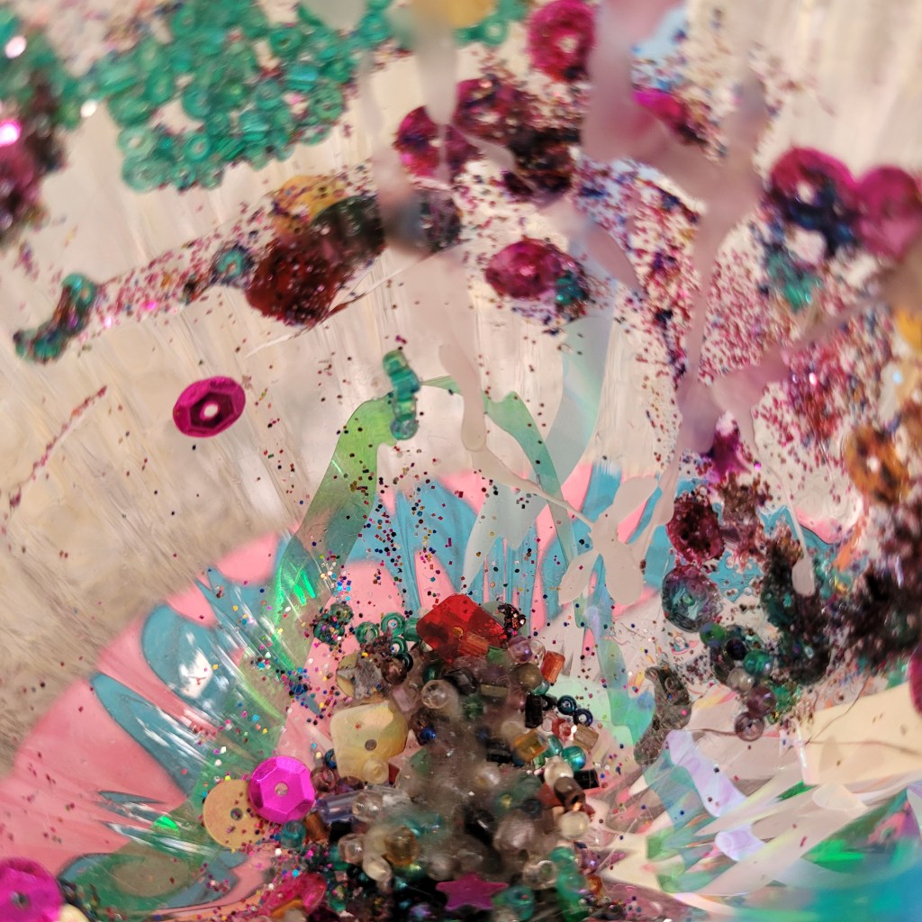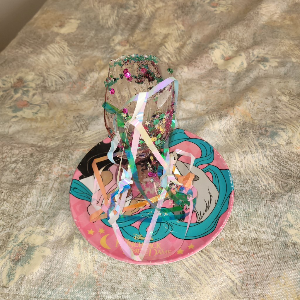 cola de silicone, miçangas, cera de vela derretida, lantejoulas, purpurina, fita durex metalizada sobre prato e taça quebrada de vidro.