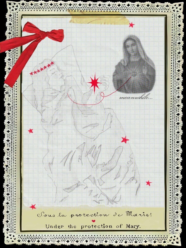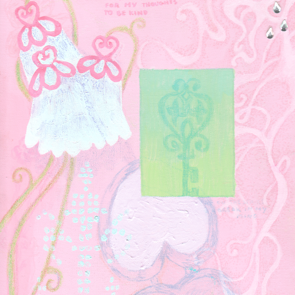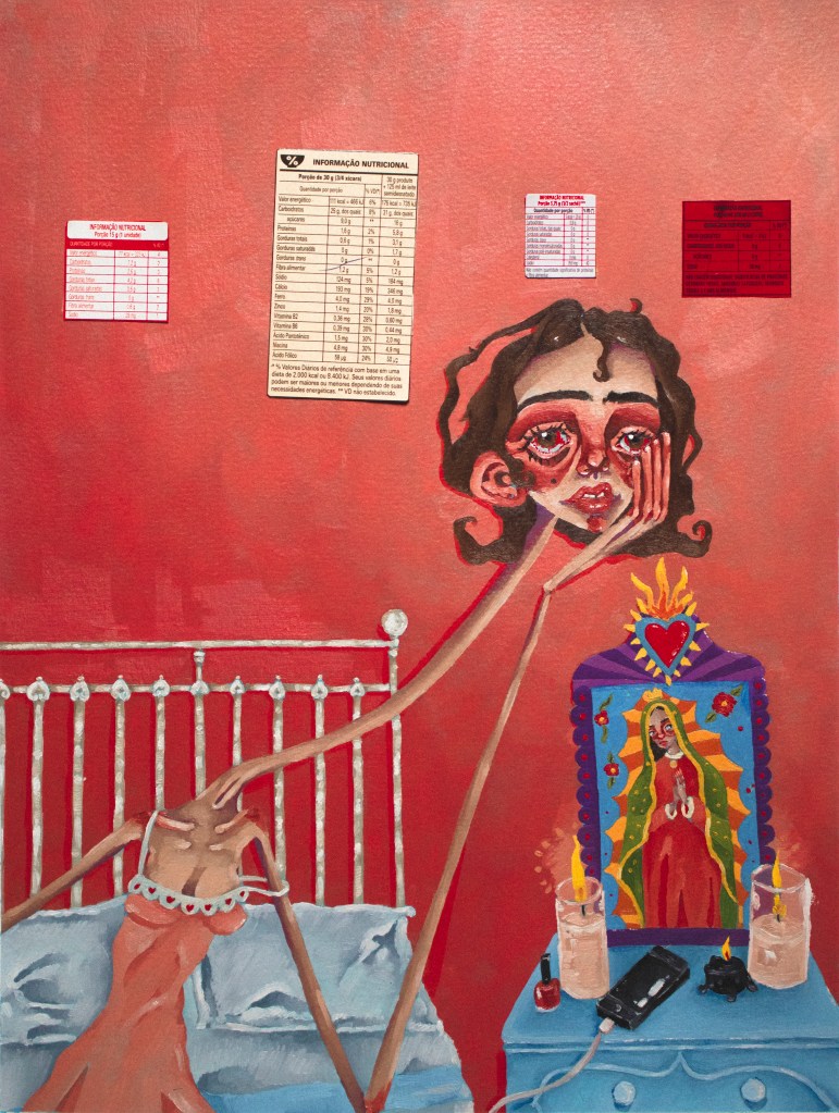 lápis, tinta acrílica, cera de vela, canetinhas, strass, pérolas, penduricalhos, pompom e giz sobre tela