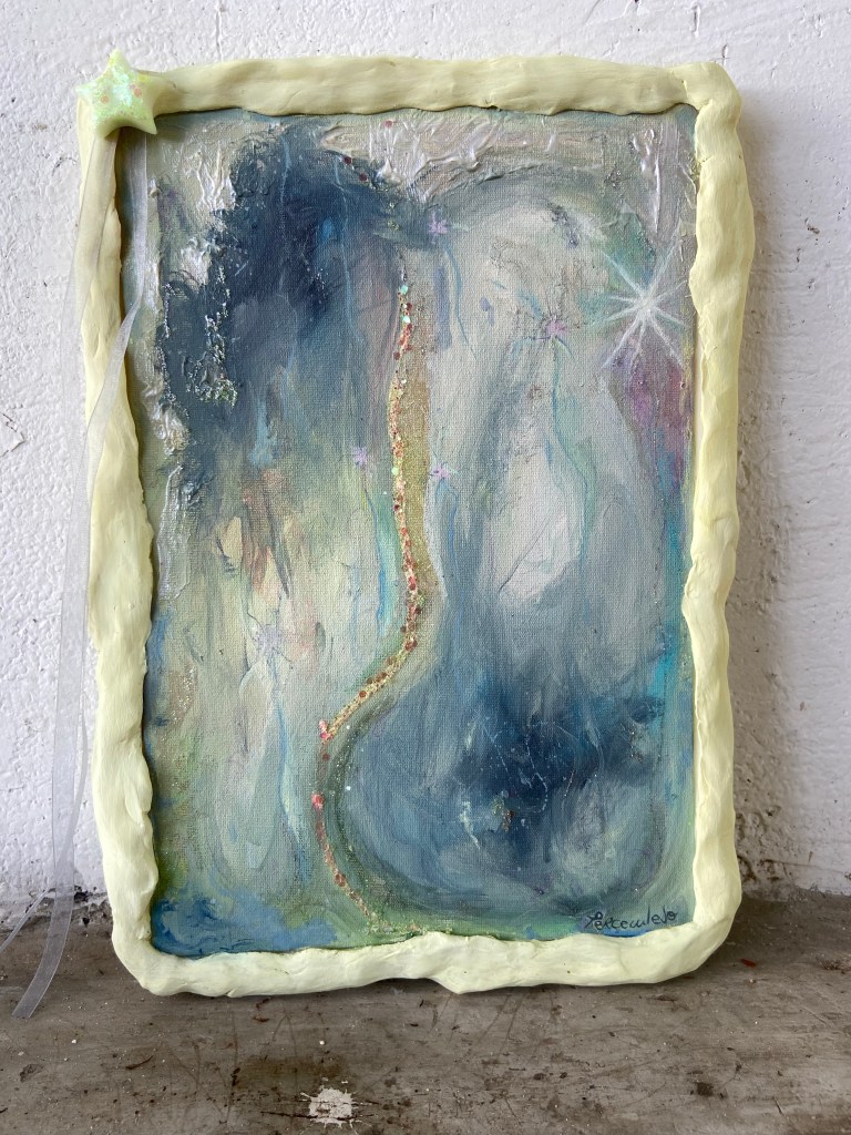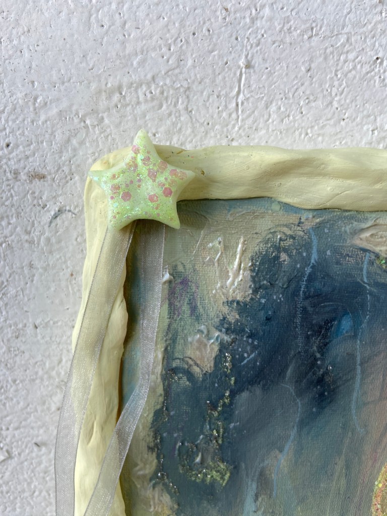 moldura de biscuit moldada envolta de tela. a tela pintada com tinta guache e partes com cola de glitter. o enfeite de biscuit colei glitter em cima e uma fita de tecido colada embaixo