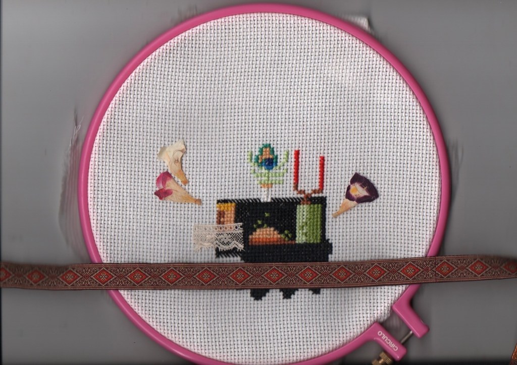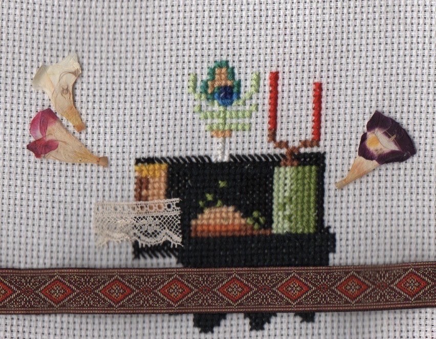 Bordado de ponto cruz, flores secas e fitas bonitas