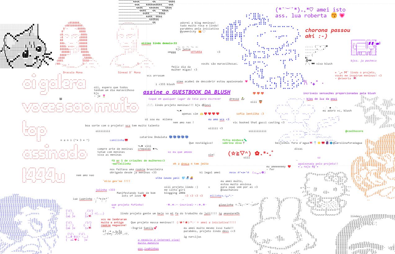 queria agradecer imensamente a todos que contribuíram com o projeto de alguma forma, seja enviando seus textos e fotos, lendo, comentando e compartilhando as postagens. vocês são todos tão interessantes e criativos, e essenciais para a blush! fico muito feliz que tenham aceitado conhecer o nosso mundinho. ver o projeto ser recebido com tanto entusiasmo, por amigas queridas e por pessoas que nem me conhecem, só reforça minha convicção de que estamos no caminho certo.