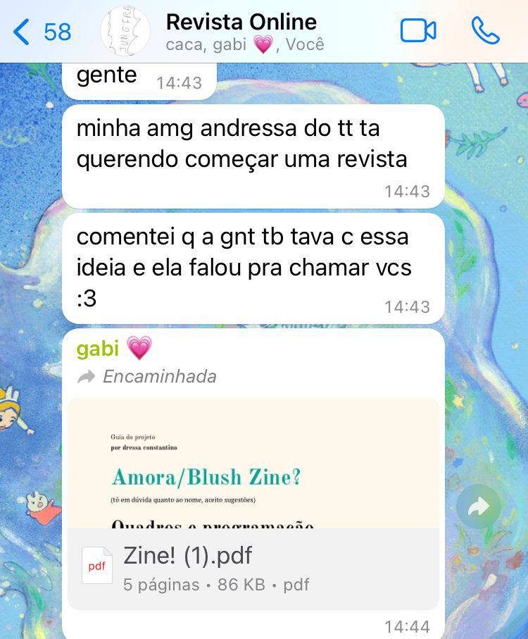 Esse mês a blush me mostrou muita coisa e fez meu coração crescer muito. Primeiramente eu amo projetos que são fundamentalmente sobre pessoas e para pessoas e explorar o potencial enorme de uma vida/pessoa através da arte. E especificamente com a blush isso é feito puramente com partilha e vontade genuína de criar e compartilhar, sem nada em troca. Criar é uma das coisas mais importantes e naturais da minha vida, e conhecer pessoas que tem esse mesmo mantra dentro delas e enxergar isso tão nitidamente em Dressa, Jéssica, Lua, Julia, Sofia e Gabi me inspira muito e me faz ser muito grata de ter conhecido elas e começado esse projeto— me enxergar em outras pessoas que eu admiro e que me inspiram— e aí a blush é o produto disso, que é também essa pulsão de criar. Muito obrigada pra todo mundo que também sentiu isso que eu senti ou algo parecido ou algo diferente, mas que no final teve a vontade de compartilhar suas criações com a blush e fazer a revista acontecer 🙂
