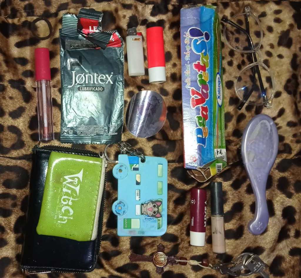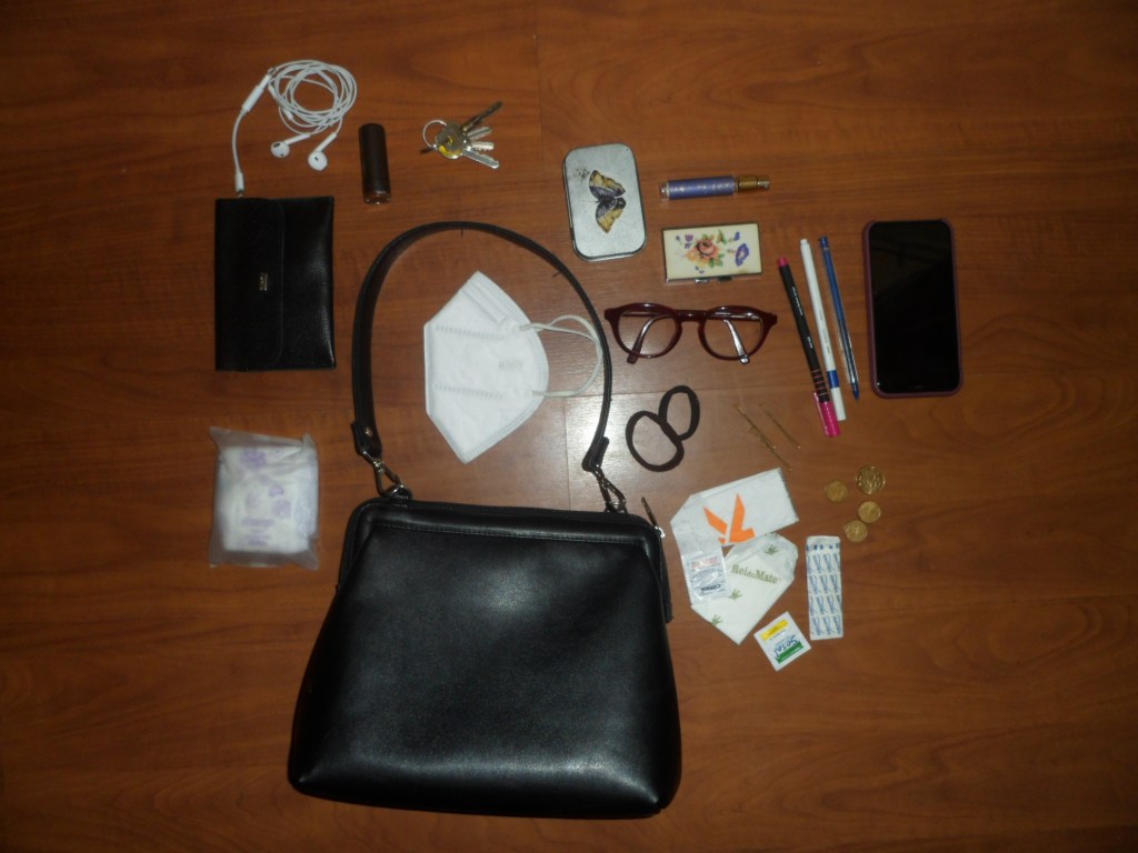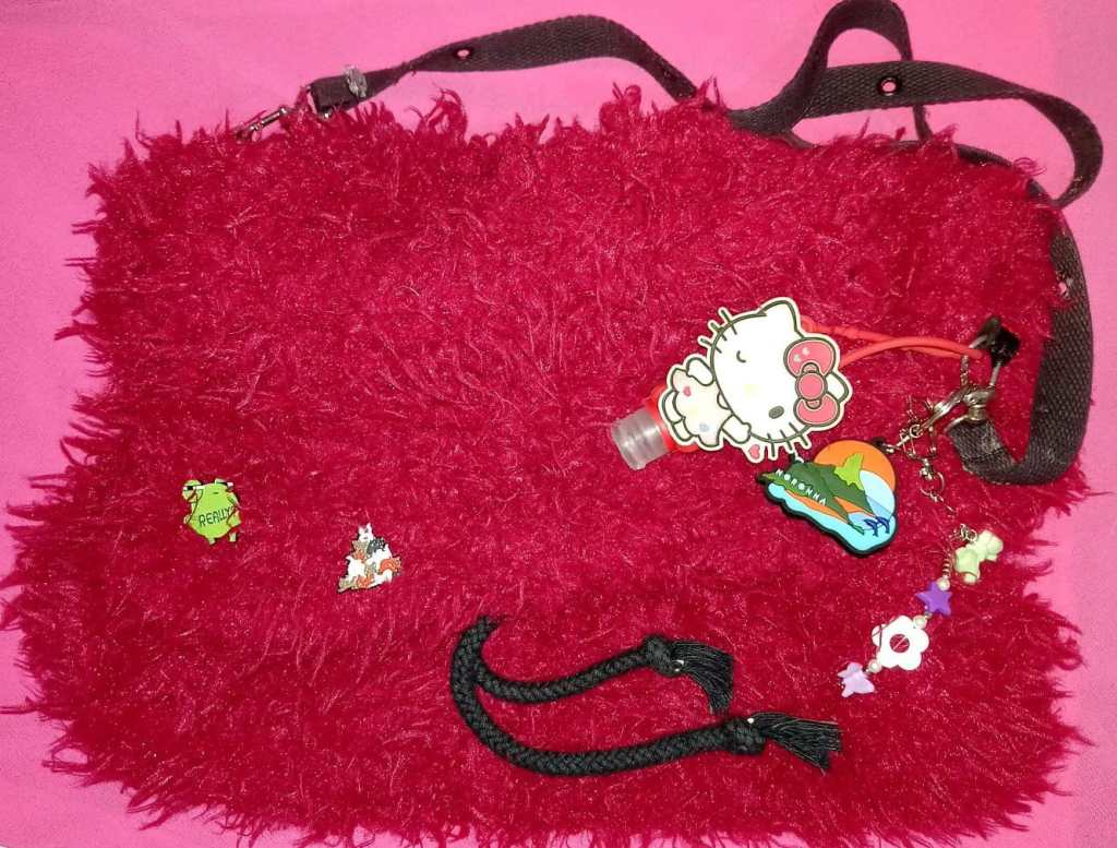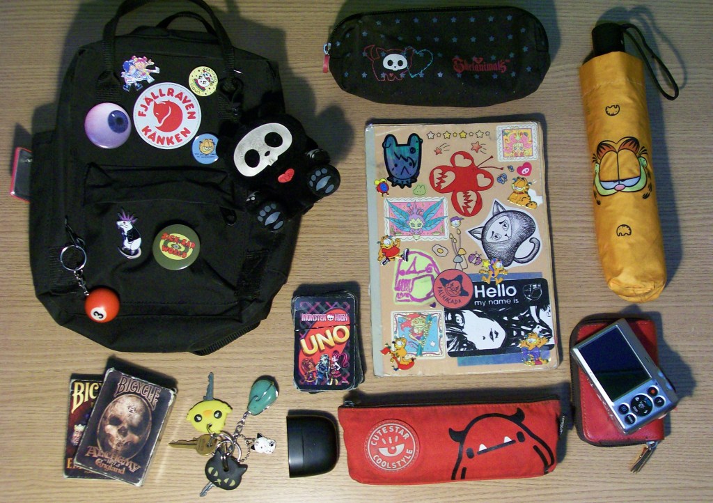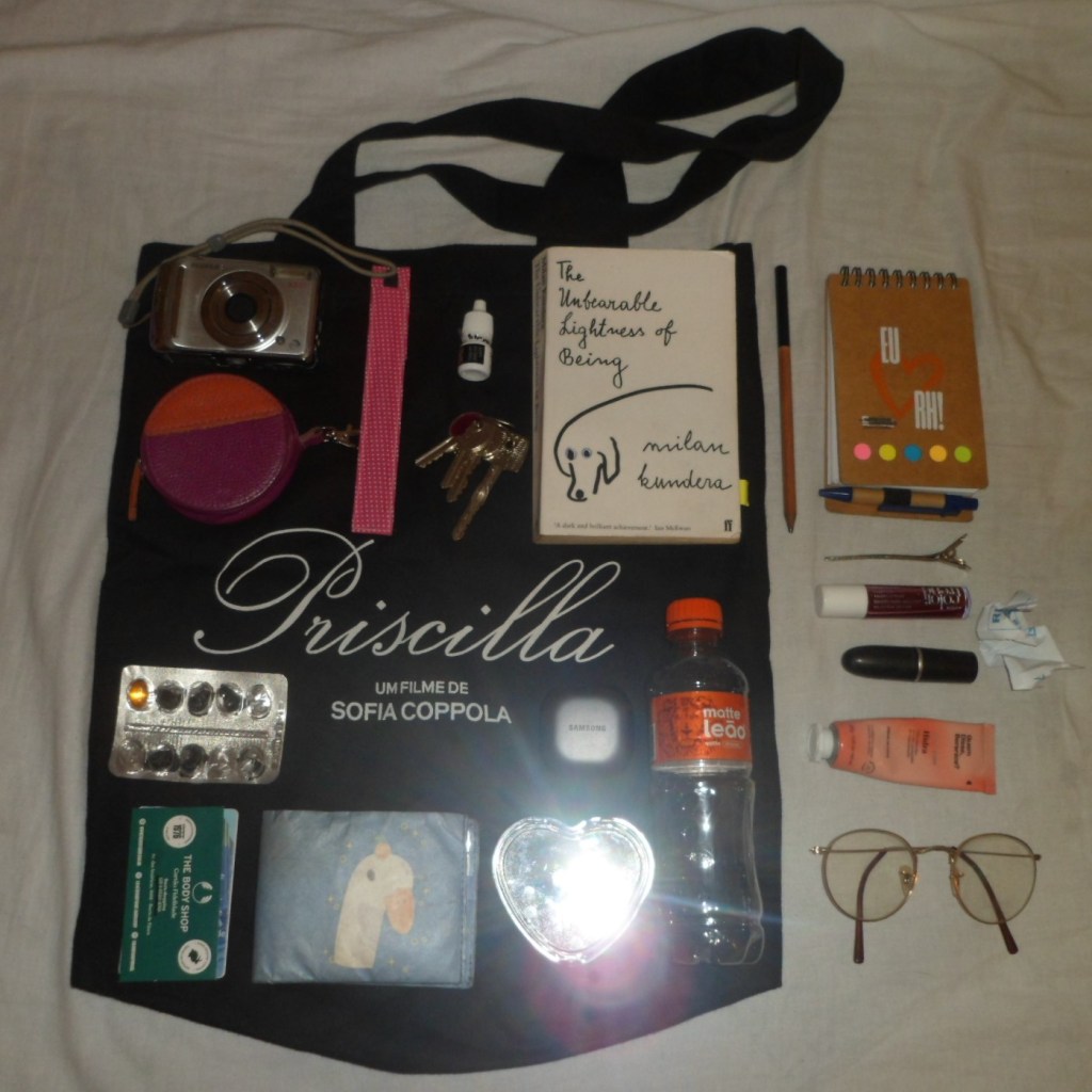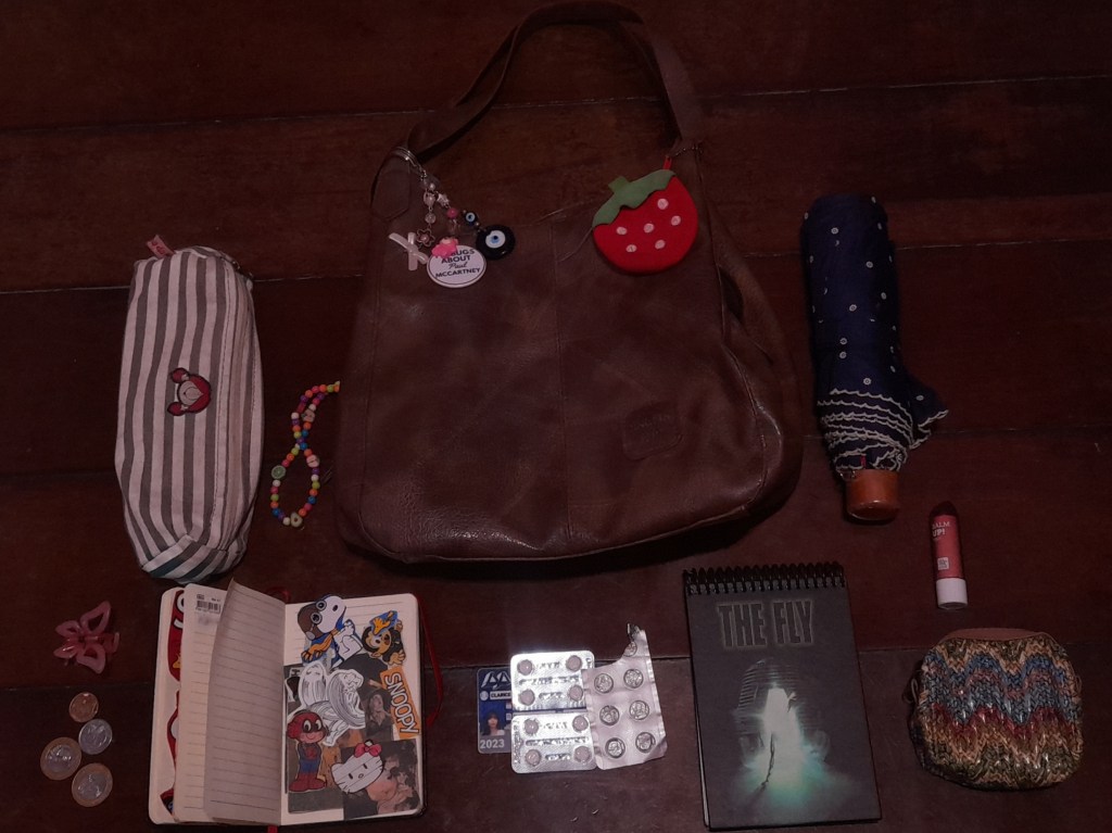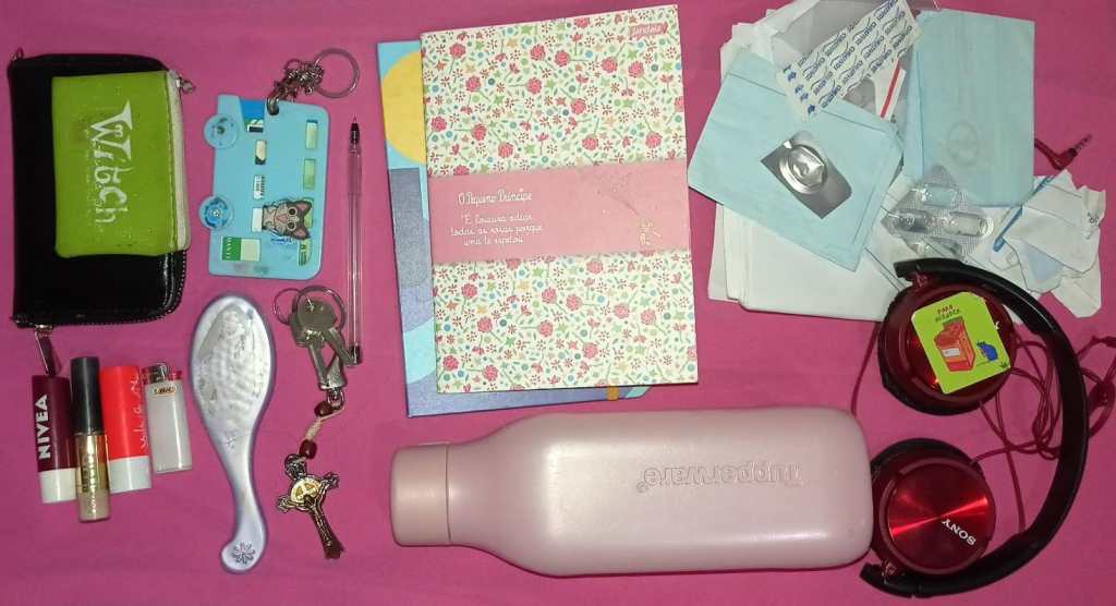 do lado de fora da minha bolsa pra ir pra faculdade tem dois pins e um chaveiro que meu amigo me deu de aniversário e de quando ele viajou e um álcool em gel da hello kitty. dentro dela tem: carteira, bolsa de moedas, passe de ônibus, caneta, chave, dois caderninhos (um pra anotar coisas acadêmicas e outros pensamentos mais íntimos), garrafa d’água, fones, escova de cabelo, isqueiro, maquiagens e muito papel velho kkjjkjk