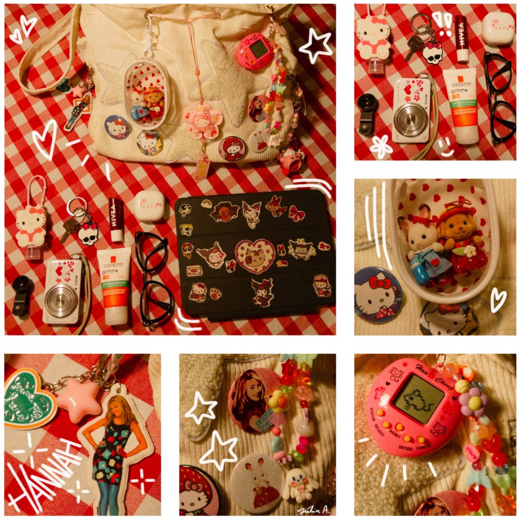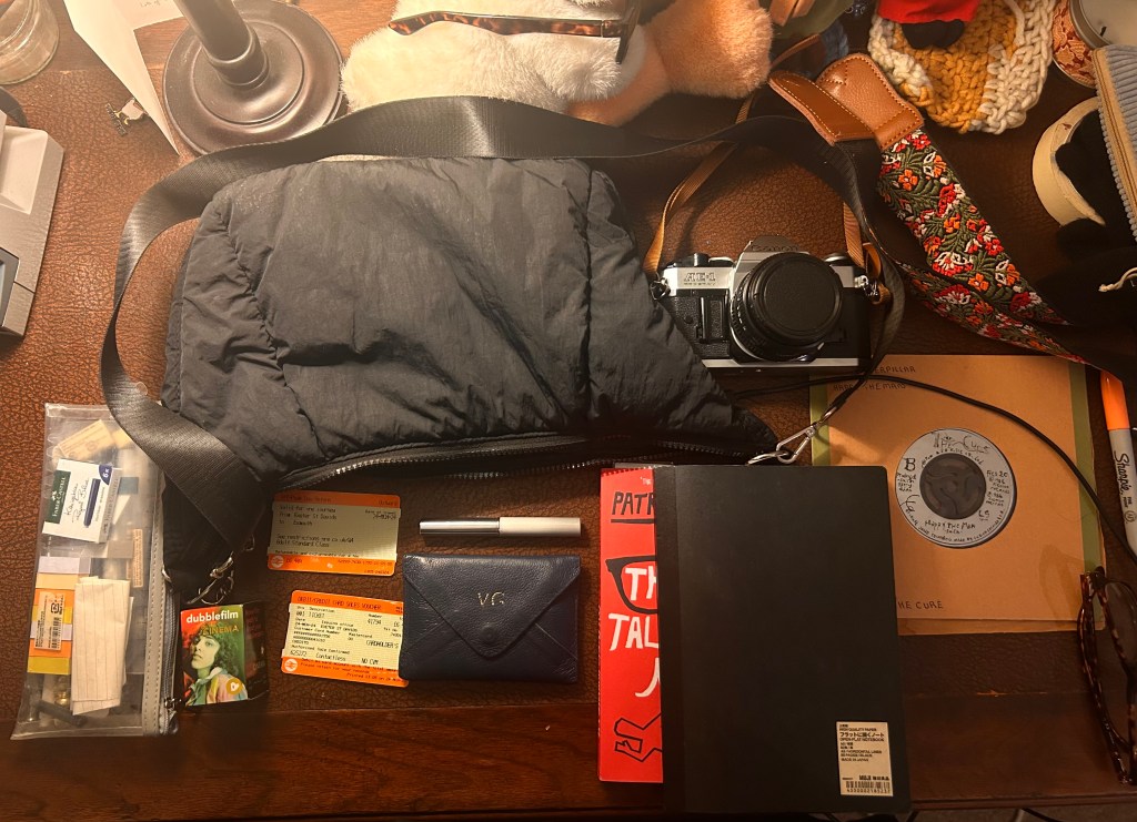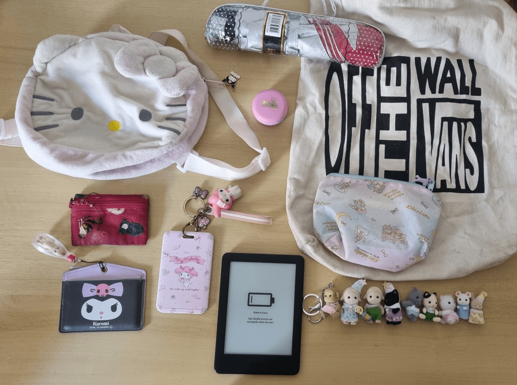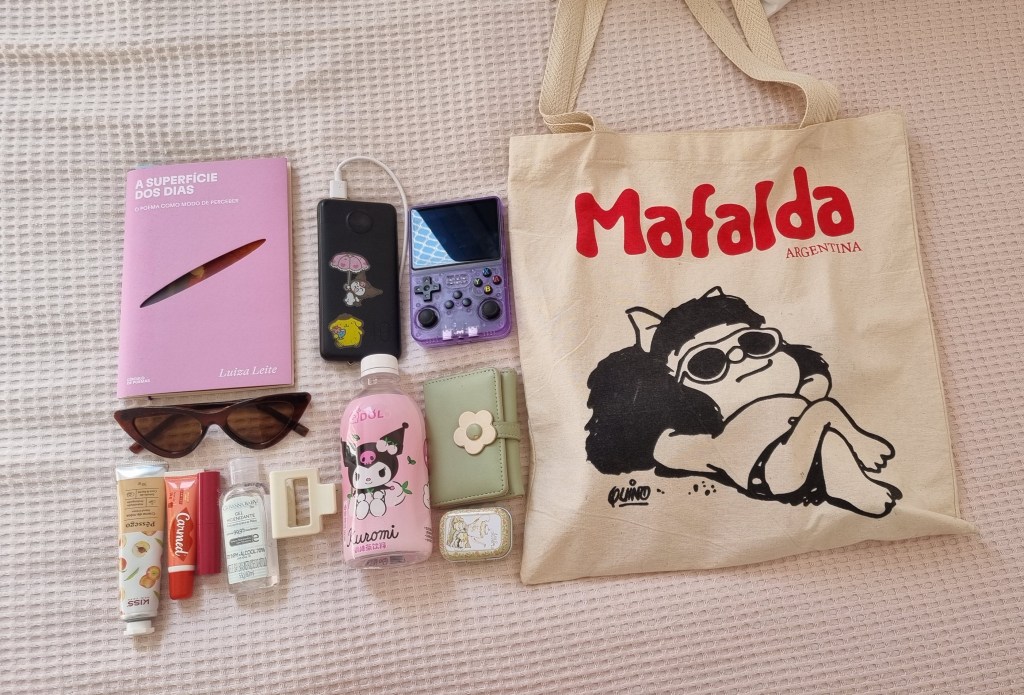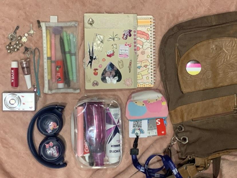 Tenho essa bolsa há quase 2 anos e levo ela para todo lugar, ela cabe TUDO que eu preciso. Recentemente ela leva: minha fiel Canon AE-1 Program Caderninho preto da Muji Livro do momento (Talented Mr Ripley) Tickets de trem Meu estojo Carteira Gloss Filme 35mm Vinil do The Cure que meu namorado me deu recentemente ❤ – Victoria Gondim, @victoriaggondimna minha bolsa tem uma combinação de cacarecos com o essencial – uma carteira da kuromi com um sonny angel dentro de uma garrafa de maionese da kewpie, um porta-cartão de transporte da my melody, um porta moeda de gatinhos, um lip balm da hello kitty com gosto de sorvete de chiclete, uma bolsinha o kiki e lala com essenciais pessoais (absorventes, remédios, álcool etc), meu kindle e guarda-chuva. também levo sylvanian families comigo. um chaveirinho da kuromi tem acompanhado minha mochila da hello kitty que tenho usado bastante e divido toda essa bagagem junto de uma ecobag que ganhei no primavera! – lua arimura, @arimuraluanaooi sou a carol e essa aqui é a minha bolsa da faculdade 🙂 não saio de casa sem meus cacarecos e principalmente a minha câmera! – carol, @d.cah.b essa bolsa eu comprei quando percebi que todas as que eu tinha na verdade eram mochilas, ou eram bolsas antigas da minha mãe. eu nunca havia realmente comprado a minha própria bolsa, aquela espaçosa e de boa qualidade pra durar anos. daí encontrei essa de couro vegetal no Ateliê Boldo e fiquei de olho por meses até ganhar coragem de comprar. nela levo meus óculos, minha caixinha de remédio com espelho (que era da minha avó), meu perfume favorito (Jardim Real da Granado), meus fones, e sempre levo também minha máscara, guardanapos de restaurantes e os sachêzinhos de sal que sobra, band-aid, xuxinhas, grampos, absorvente, caneta, kit de costura, batom… às vezes enfio algum projeto de tricô ou algum livro que esteja lendo, mas por enquanto ela tá assim. minha carteira da Soulier foi uma outra aquisição que, junto da bolsa, me fez me sentir uma adultinha preparada pro mundo. – jéssica, @je062803౨ৎ⋆˚。⋆ minha bolsa não só compõe meu dia, ela é minha melhor amiga quando estou me sentindo insegura e preciso de algo para pôr no colo! minha bolsa me dá tudo o que preciso e mostra quem eu sou com os cacarecos que coloco ao redor dela. e o mais especial: aos quase 20, agora percebo que, assim como minha mãe, chegou a hora de carregar tudo que for preciso. 🩰🦢🕯️ – ju araujo, @luminadejulia & @juaraujo.oessa é a minha bolsa por dentro, um reflexo de mim por inteira, nela eu levo minha carteira, meus produtos de higiene, meu fone e cybershot, meu caderno de anotações para as aulas + meu sketchbook! além de sempre levar um estojo e alguns pequeninos que nao podem faltar como; minha chave, presilha, esmalte e meu cereja shine! espero que gostem, nao tem nada de muito especial nela mas é diferente de sua maneira ,, – yasmim lino, @i4ryuk