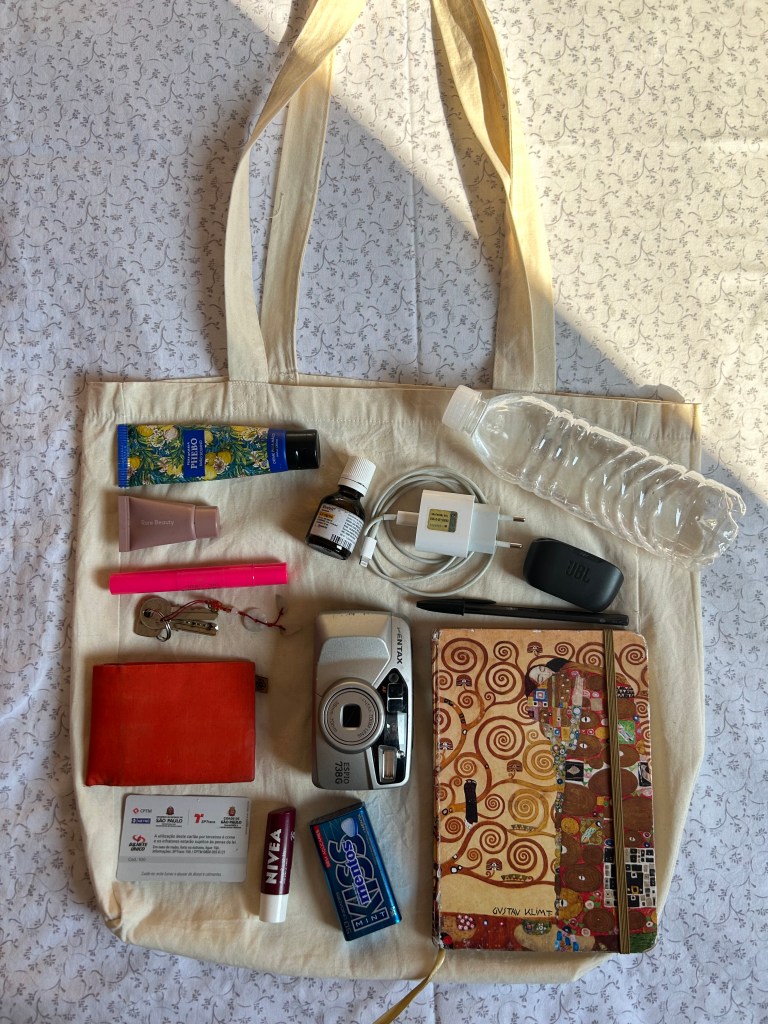 sempre hidratada e pronta pra tirar uma foto! minha city girl tote bag preparada pra tudo com bilhete único, chaveiro da liberdade, diário, fone de ouvido e rivotril 🙂 – marina emily, @maristemily