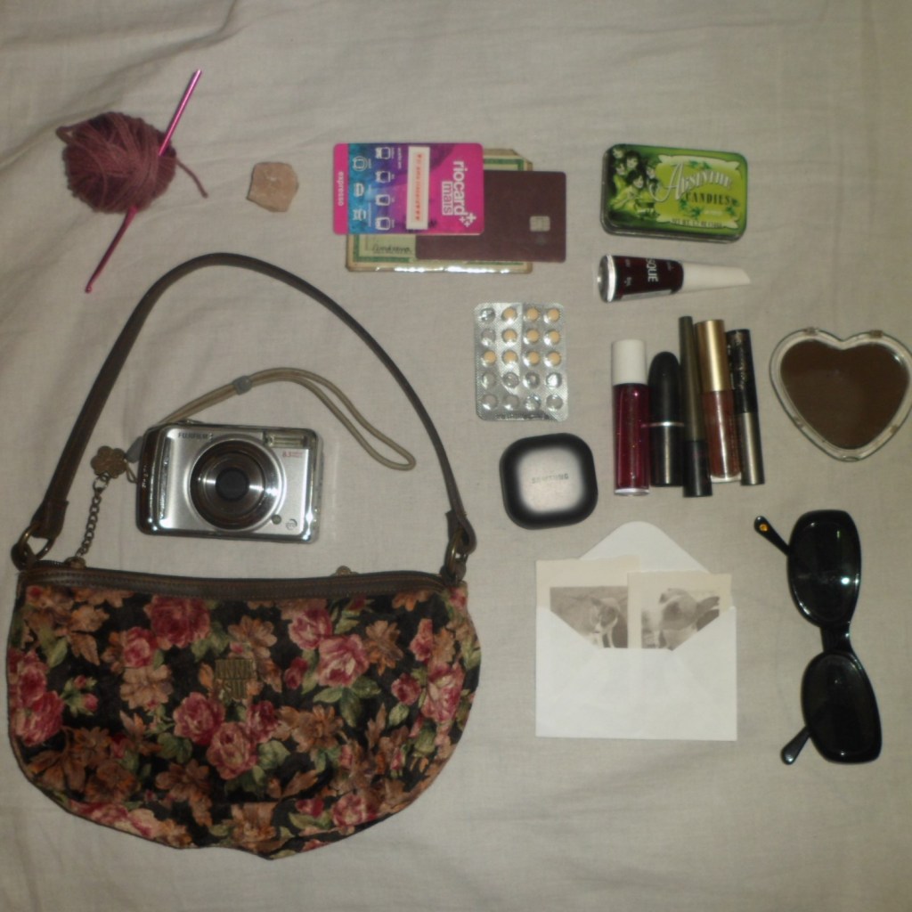 como faz um tempo que não saio para a noite (</3), tentei recriar nessa foto o que acontecia toda vez que eu saía: era sempre com minha bolsinha da anna sui que encontrei por um preço ótimo no brechó, e toda semana eu levava todas minhas maquiagens; brow gel, batom que é blush, gloss e delineador, e um mini quartzo rosa, esse envelope com 2 fotos da minha cachorra que minha irmã me deu e ficou escondido no bolso lateral para sempre, óculos de sol (eu finjo não ter miopia), esmalte rebu para retocar as unhas no metrô, uma latinha super secreta, agulha de crochê e um novelo de lã, riocard, cartão de crédito, id e remédio para ansiedade. e a ausência das minhas chaves de casa, que já me causou muito estresse :0