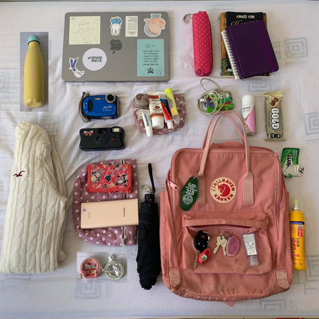 Como é o meu primeiro período, decidi abandonar a mochila pesada cheia de livros e aderir ao estilo Birkin de bolsa cheia de penduricalhos. Nela carrego um caderno de anotações, estojo, um “junk journal”, remédios para sobreviver e a carteirinha do ensino médio como uma forma de carinho. Considero-a um novo começo, onde ainda temos muita jornada pela frente e muitos cacarecos para pendurar. – Clarice, @clajeca
