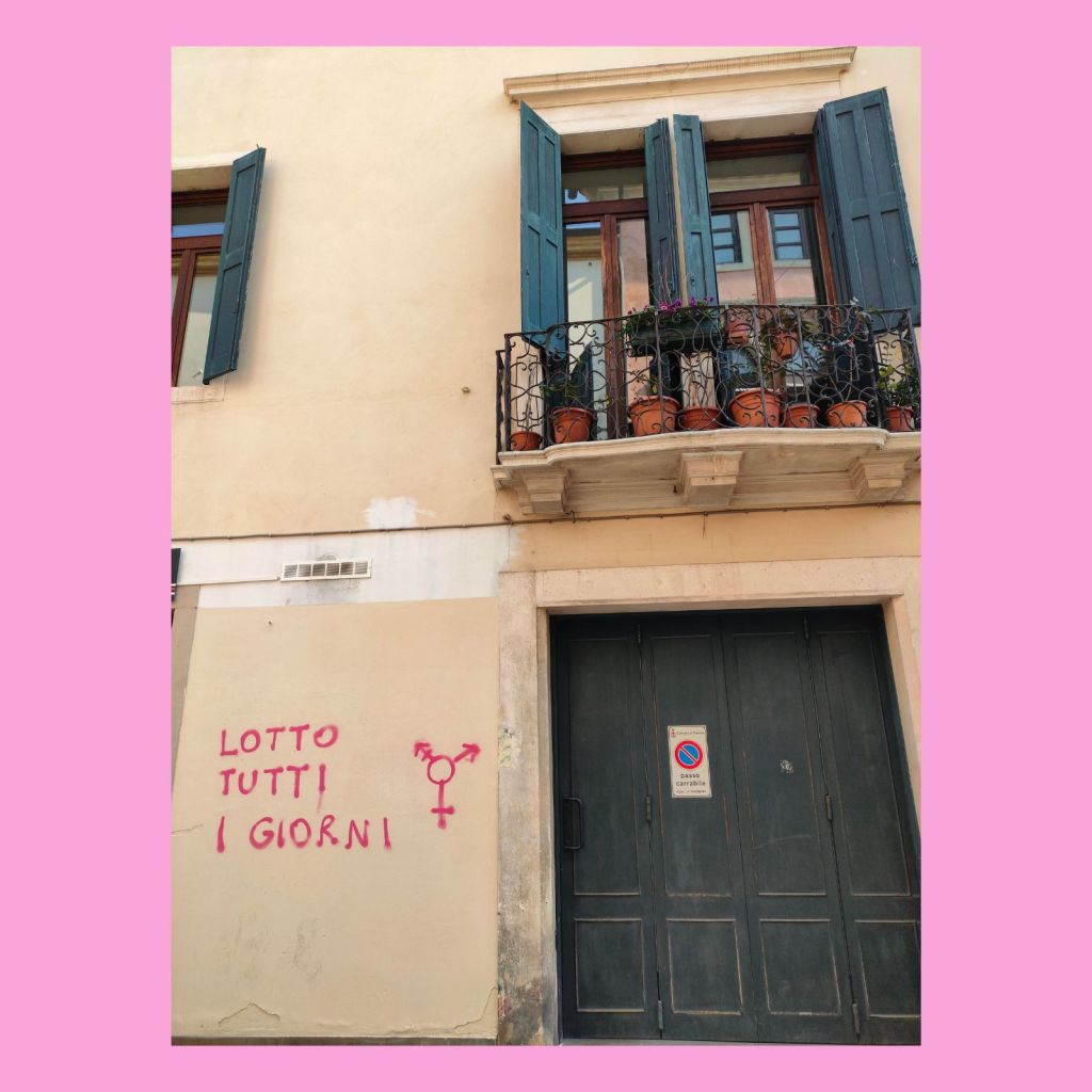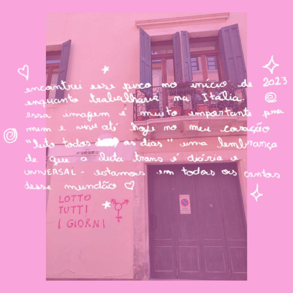 encontrei esse pixo no início de 2023 enquanto trabalhava na Itália. essa imagem é muito importante pra mim e vive até hoje no meu coração: “luto todos os dias”, uma lembrança de que a luta trans é diária e universal – estamos em todos os cantos desse mundão ❤