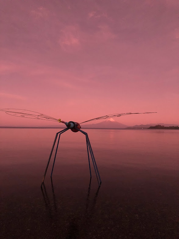 quando eu e meu pai viajamos de carro pelo Chile, dormimos numa cidade que tem vista pro vulcão Osorno. nesse dia, nos divertimos olhando as esculturas montadas à beira do rio. insetos gigantes de metal, rígidos e, ao mesmo tempo, vivos, como que prestes a decolar no céu rosa. cena do carbonífero. o ar parou por alguns instantes.