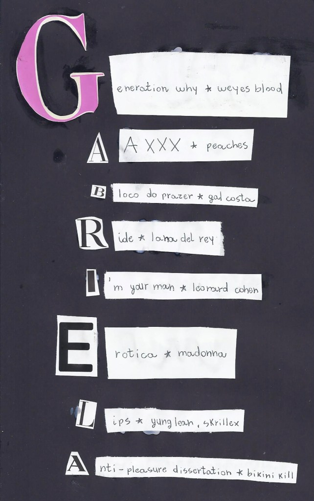tava sem ideias, então decidi fazer uma playlist pela forma: as iniciais dos títulos de cada música, juntas, formam meu nome, GABRIELA. claro, elas também dizem uma coisa ou outra sobre mim.