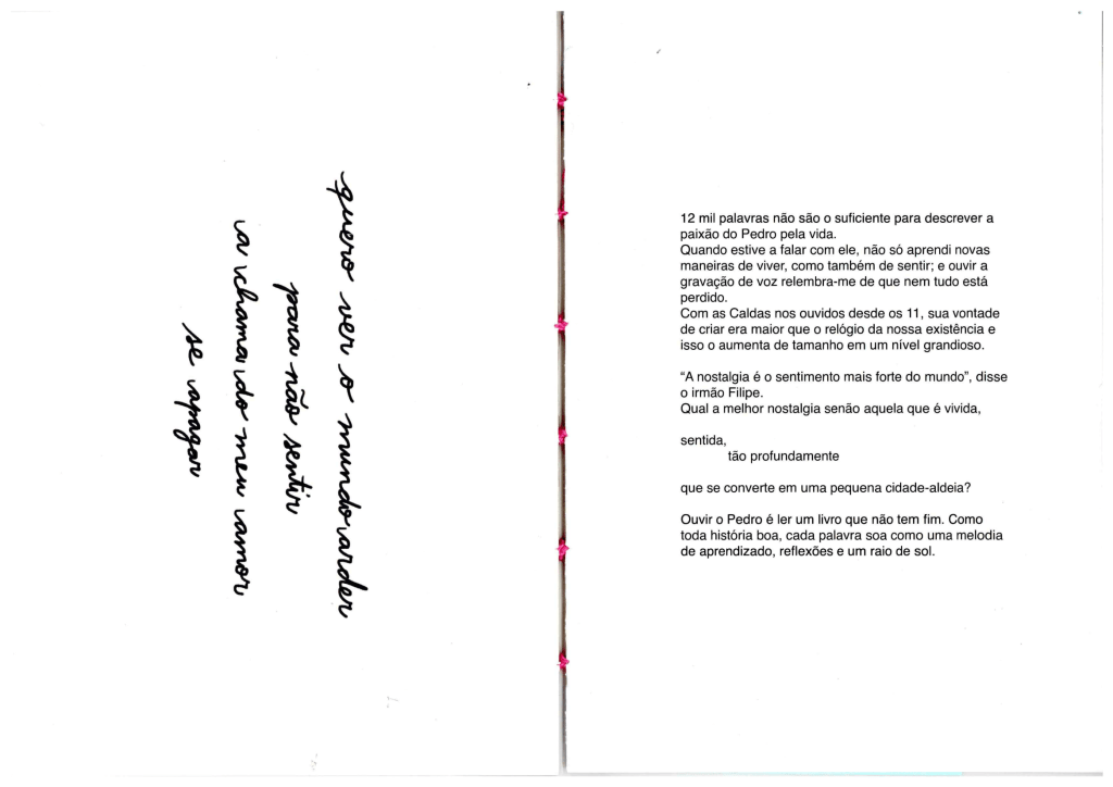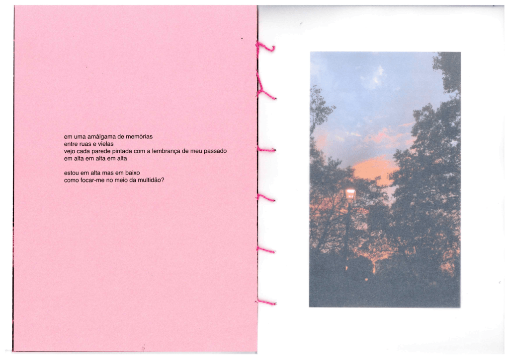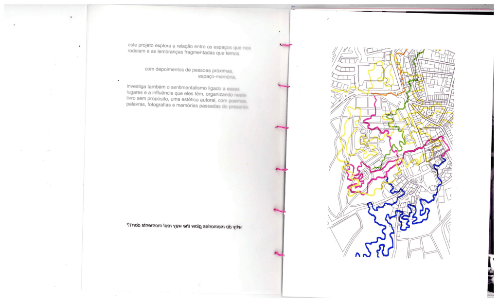ao explorar a relação entre os espaços que nos rodeiam e as lembranças fragmentadas que temos com depoimentos de pessoas próximas, este projeto investiga o sentimentalismo ligado aos lugares da cidade das Caldas da Rainha, Portugal e a influência que eles têm, organizando num livro-objeto uma estética autoral, com poemas, palavras, fotografias e memórias passadas do presente