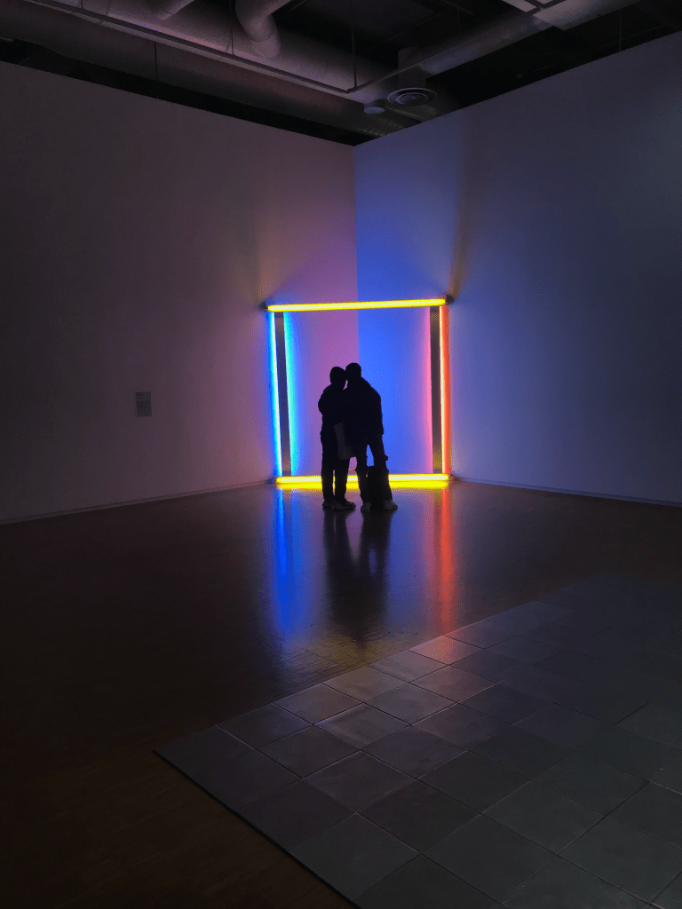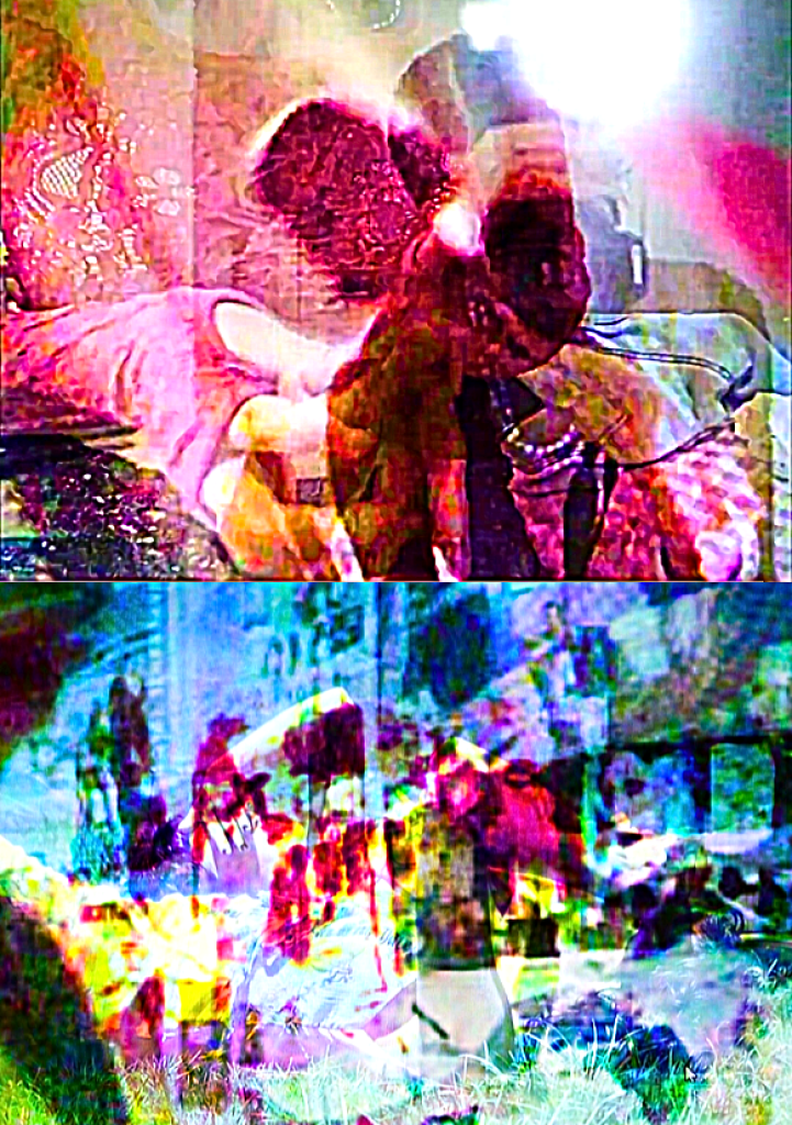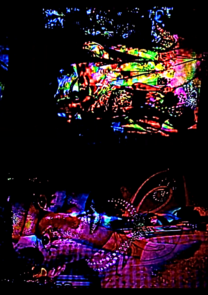 acrílica, óleo, carvão, spray, fita metalizada e crepe sobre tela. emoldurada em madeira rosa