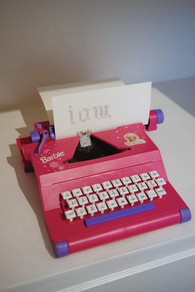 “uma homanagem ao hábito de escrever em diários e blogs. usei uma máquina de escrever da barbie, que ganhei quando era criança, e datilografei as palavras “i am” em ASCII. as palavras vem do livro A Redoma de Vidro, de Sylvia Plath (só fui ler esse livro depois de encontrar trechos no tumblr). o texto em ASCII foi gerado online, e depois transcrevi os caracteres na máquina de escrever. me interessa a interseção entre diários físicos e virtuais.”