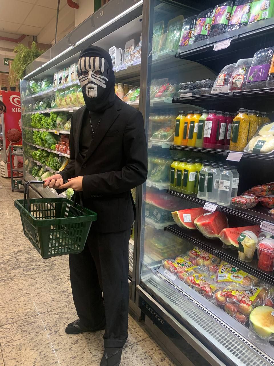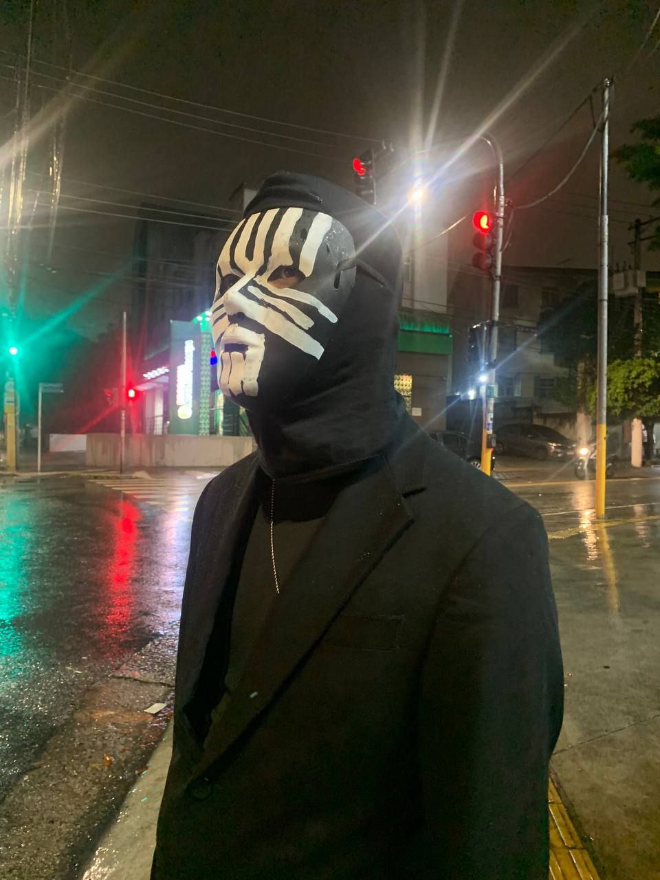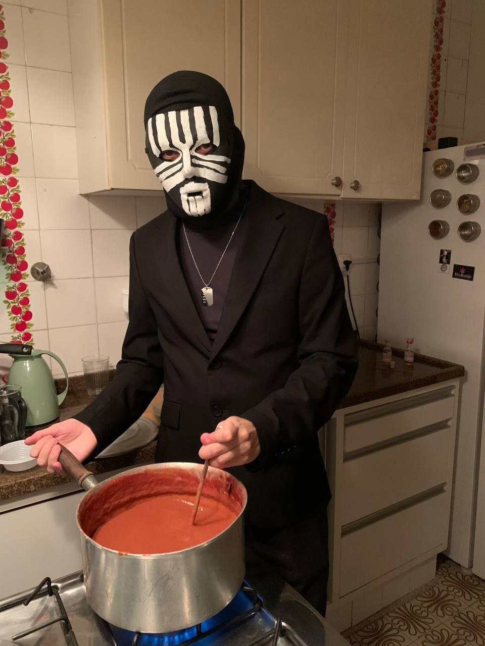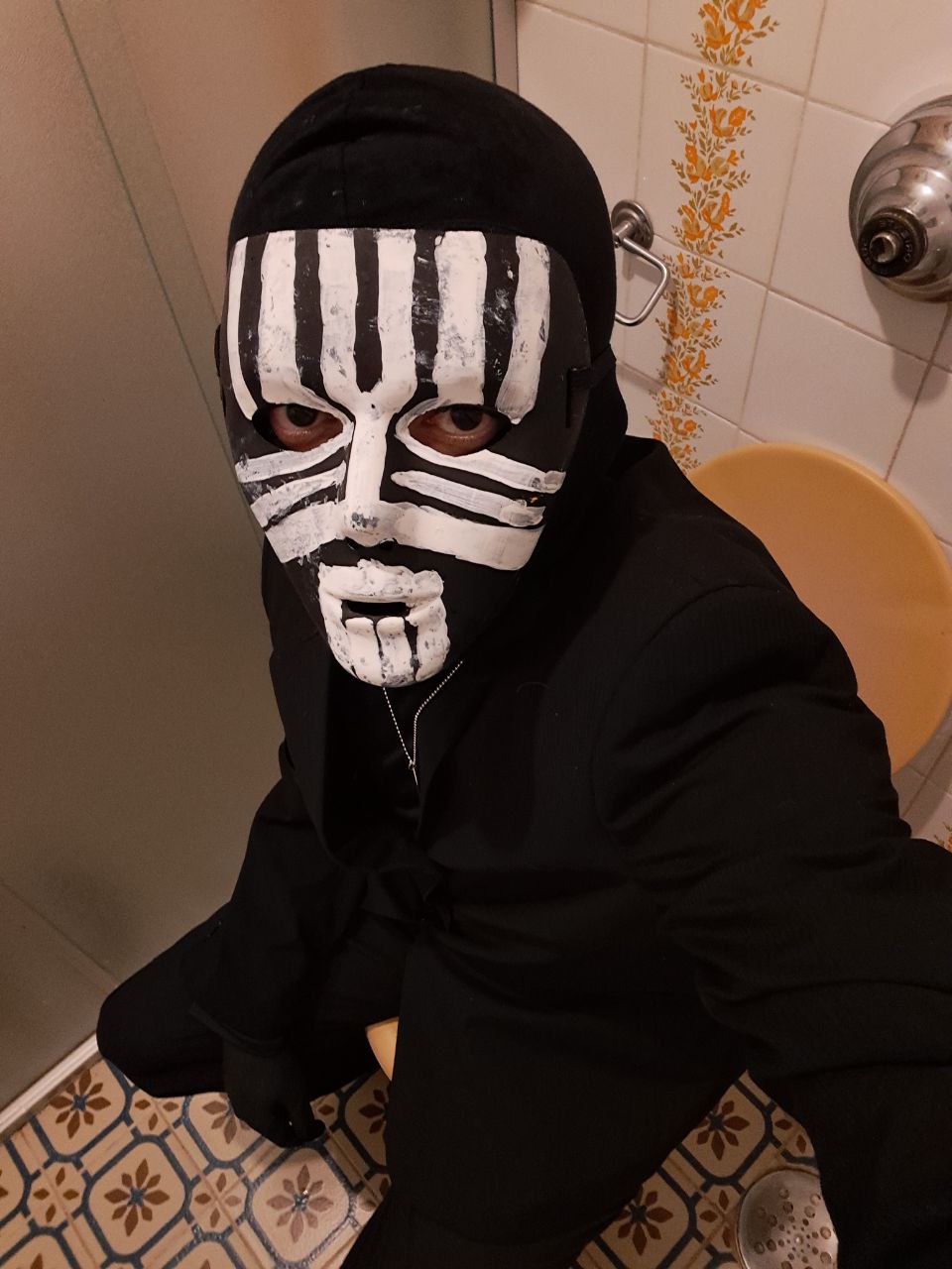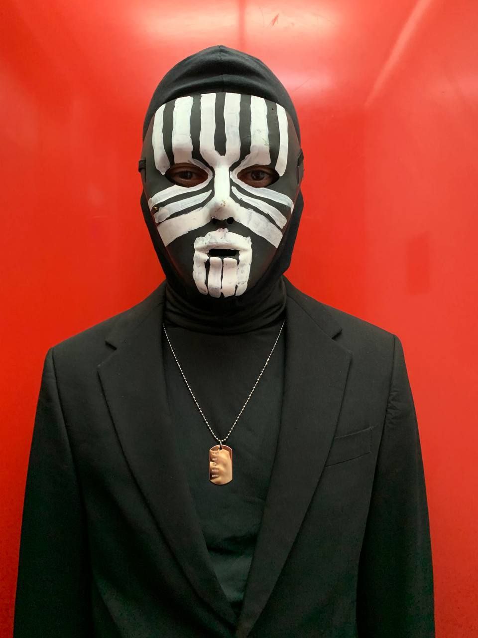 ID da fantasia: já tinha a calça e o blazer pretos; comprei a camisa gola rolê, a balaclava e a dogtag na shopee; comprei a máscara e as tintas numa lojinha de fantasia e pintei na mão usando algumas imagens de referência. não ficou exatamente do jeito que eu queria mas ficou reconhecível!