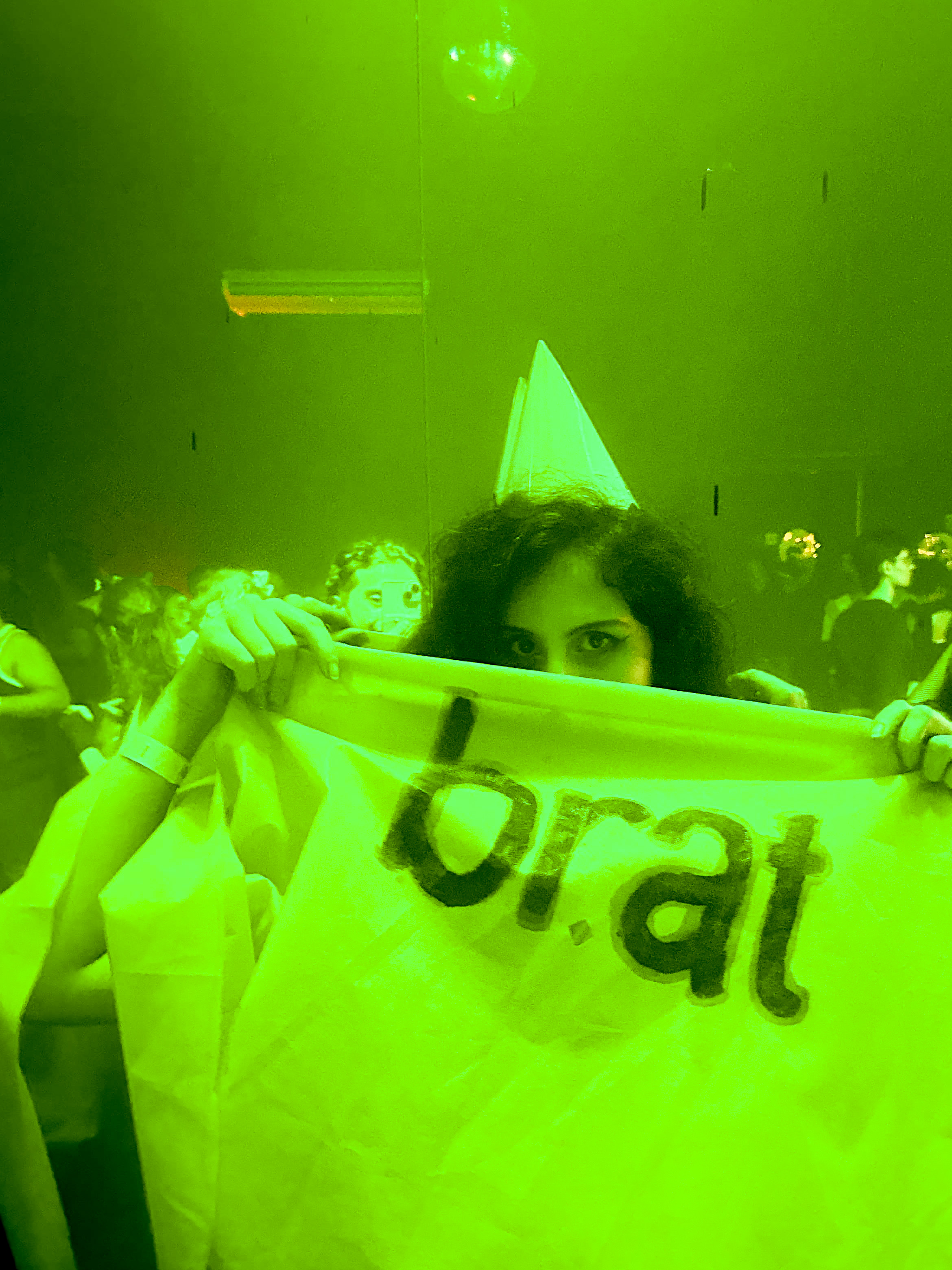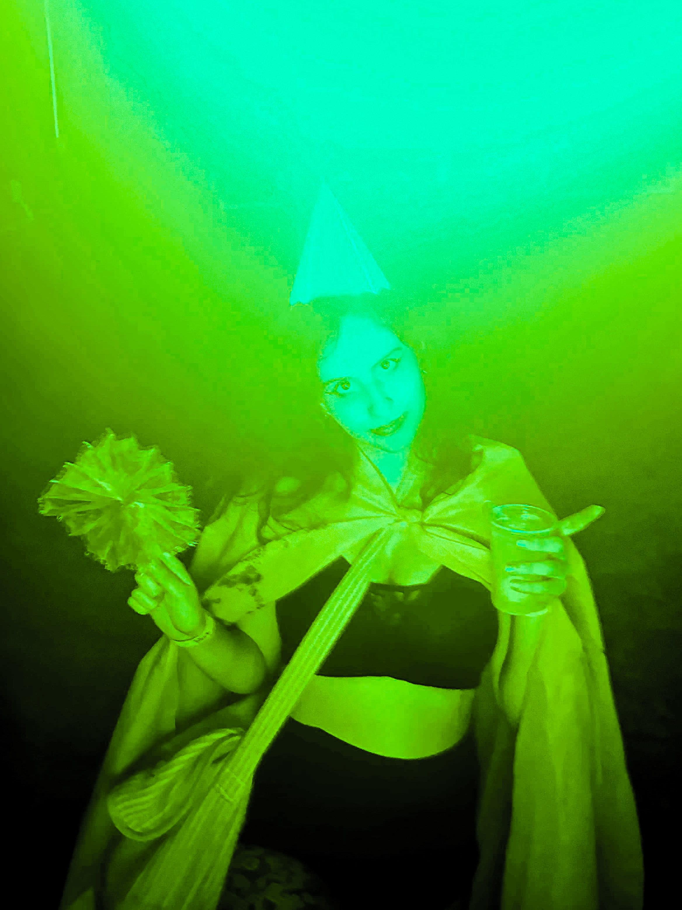 sutiã e shortinhos eu que fiz, a capa de TNT eu cortei correndo e tentei copiar o lettering do brat com tinta acrilex (e manchei até meu colchão no processo), leque improvisado DIY com organza e palito de sorvete, meia calça trifil e chapeuzinho barato da loja de festa do meu bairro