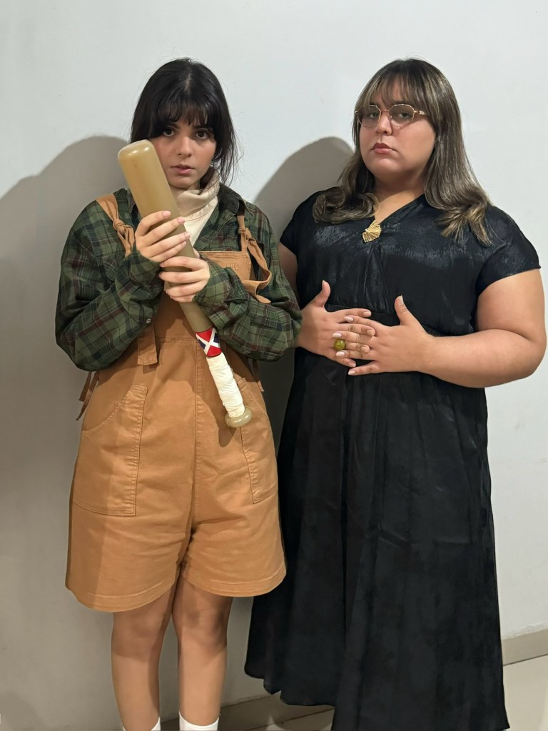 ID da fantasia: wendy: macacão marrom dendezeiro+c&a; camisa de botão quadriculada emprestada do namorado. laura: vestido e broche renner; sapato de estilo veggie shoes; anel de porto de galinhas.