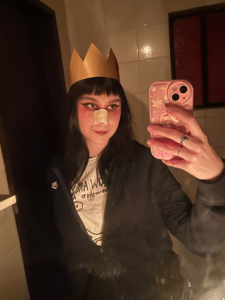 ID da fantasia: fiz a coroa só com cartolina dourada e usei kit primeiros socorros daqui de casa, além de usar minhas roupas do dia a dia