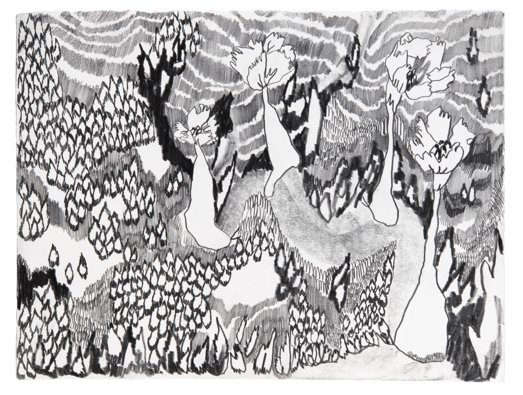 O que me encanta especialmente é a possibilidade de ancorar experiências que envolvem os cinco sentidos do meu corpo no aqui e agora. Me interessa muito investigar como posso transformar essa atenção sensorial em acontecimento através do desenho. É uma prática que toca também questões de espiritualidade, e por isso sempre destaco a importância da minha investigação em relação à possibilidade de criar e imaginar futuros mundos. Fui me apaixonando pelo desenho conforme descobri todas essas possibilidades, porque elas dizem respeito a uma vida mais saudável e que me enche de esperança.