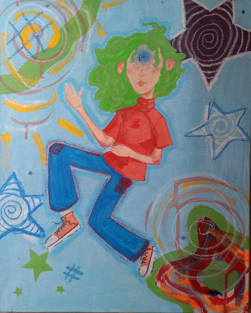 pintura em acrílico, pastel e pequenos cristais adesivos