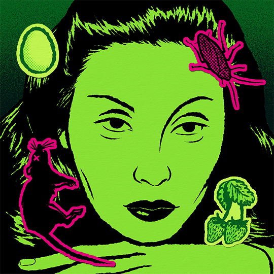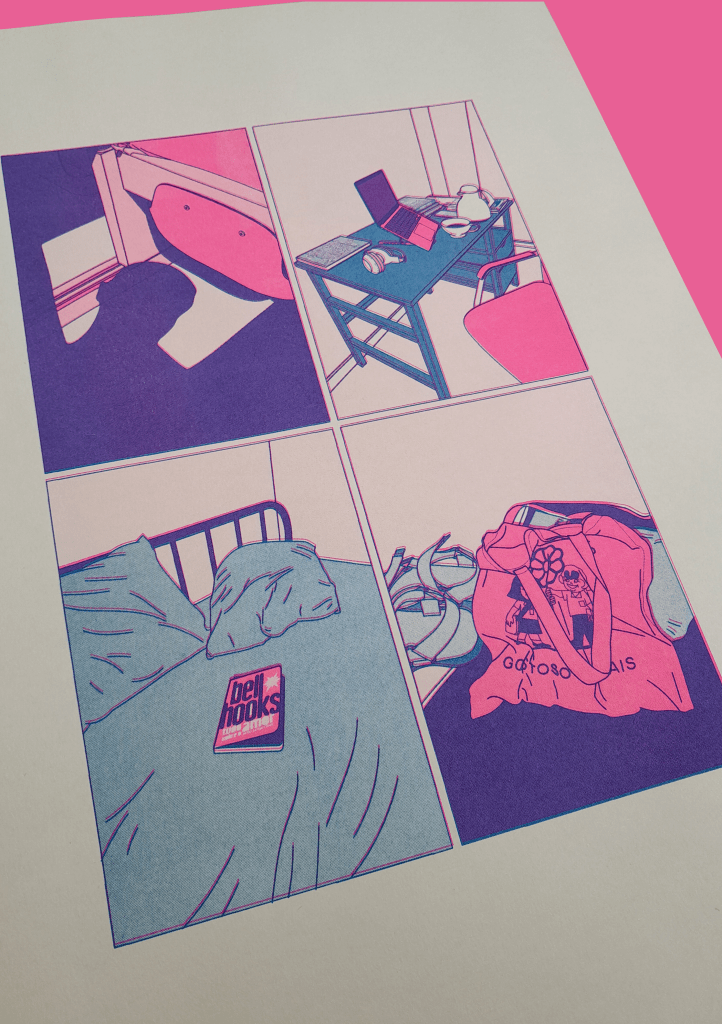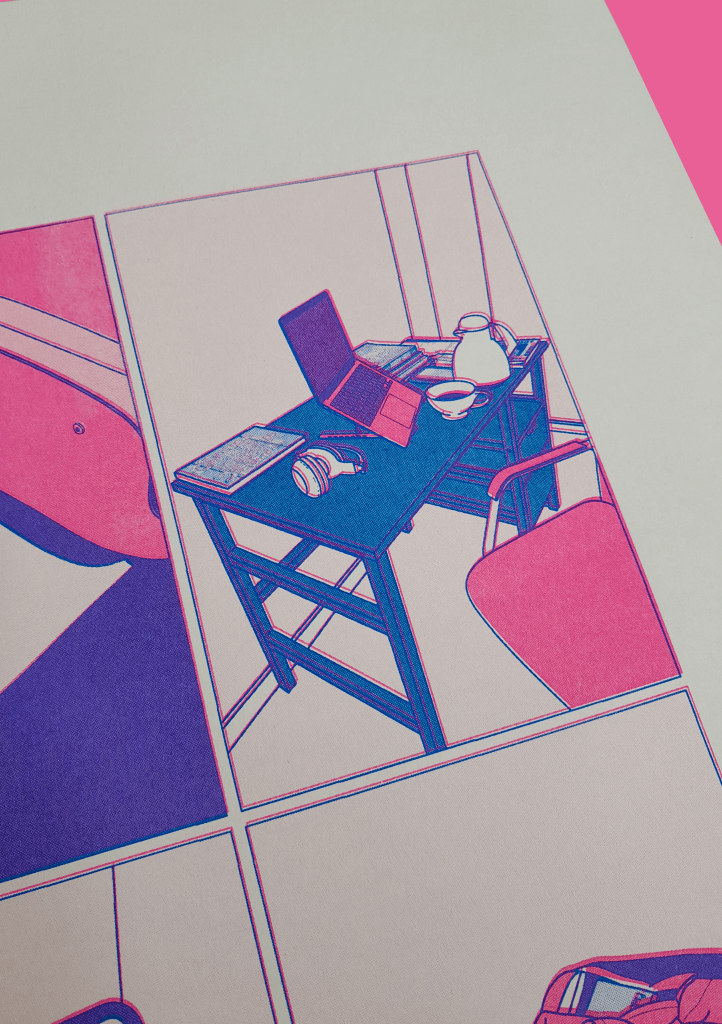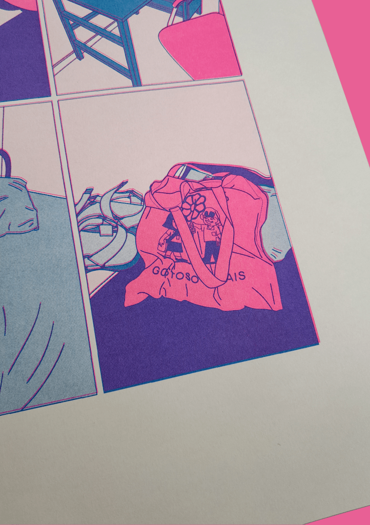 Ilustração digital impressa em risografia de duas cores (rosa e azul) A3