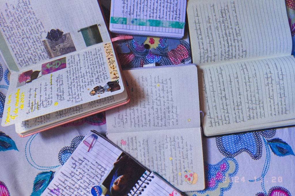 “escrever diários sempre foi um dos meus hobbies favoritos, pois sempre vi a escrita como uma amiga. desabafos, colagens, adesivos fofos e canetas coloridas fazem parte do meu refúgio pessoal. em uma série de 14 fotografias, trago detalhes dos meus diários mais complexos, onde exploro minha própria mente e alcanço meu desejo pessoal de lembrar e ser lembrada.”