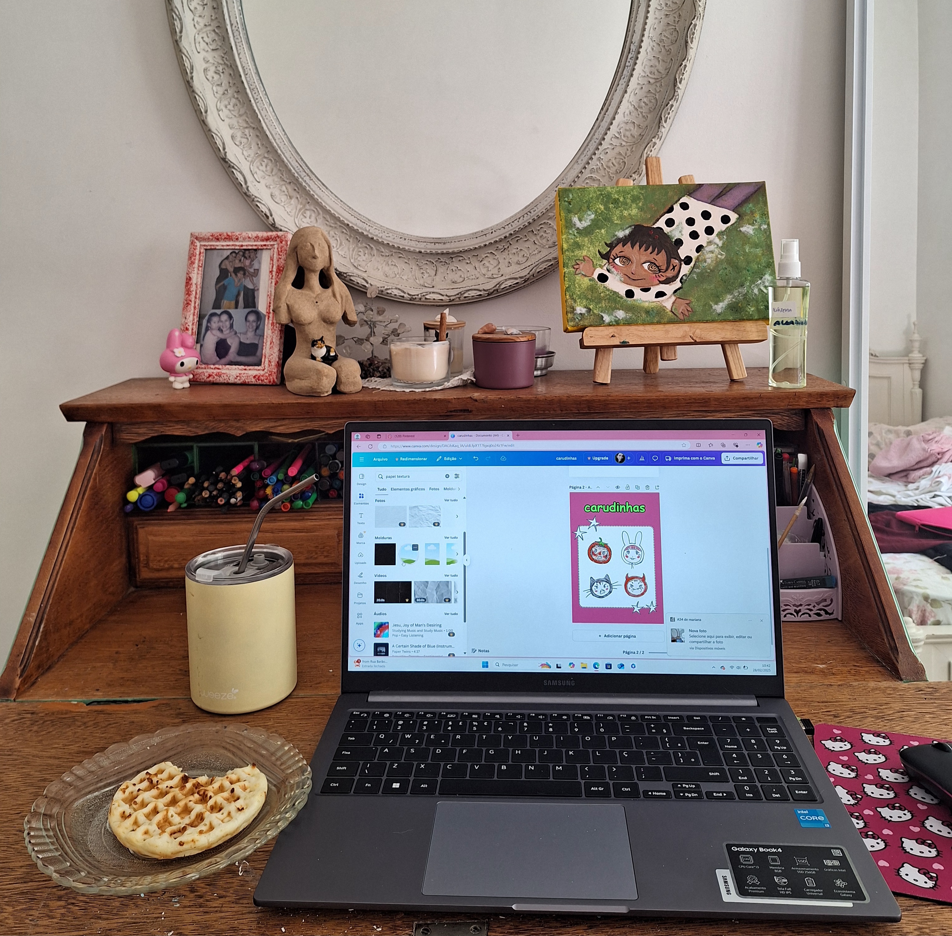 Seja a tela do seu PC, com inúmeras abas abertas cheias de coisas interessantes que ficamos curiosas para conhecer. A sua mesa cheia de cacarecos, numa mistura de home office com vida pessoal ou ainda: um laboratório, um órgão de arquivos histórico, um ateliê de pintura, outro de costura, e por aí vai…