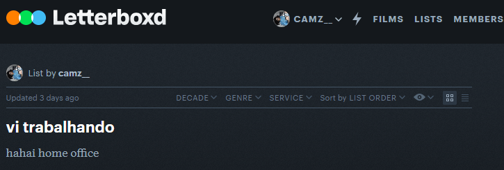 no dia 23 de novembro de 2023 eu criei uma lista no letterboxd que perdura até hoje. a “vi trabalhando: hahai home office”. na época, eu e meus dois amigos de curso (caio e enzo) estávamos prestes a apresentar nossos tccs, era um fim de fase (e de ano), e as possibilidades pareciam infinitas. iríamos cursar ainda um período final com duas disciplinas para poder escrever nossos pré-projetos de mestrado. um deles, caio, chegou um dia no grupo falando que a tia dele viu um vídeo no youtube sobre um freela facinho: digitar notas fiscais. juramos que era uma empresa fantasma envolvida num esquema de pirâmide. até hoje, quando conheço alguém e o papo se encaminha para esse assunto, eu rio dizendo que ainda acho que um dia vou ligar a televisão e o fantástico vai noticiar o esquema fraudulento. mas, na verdade, é só um bico tranquilo. e, para passar o tempo, sempre assisto ou escuto algo enquanto trabalho.