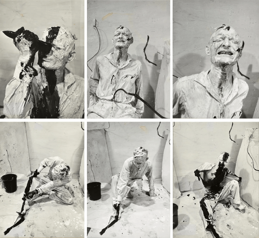hum… certo. ok que ele realmente usava o próprio corpo em performances, mas, anni brus, a sua mulher, também, e é cômico até ler sobre como ela “exerceu um papel fundamental no trabalho do marido”. por favor, quantas esposas de artistas são taxadas em biografias dessa maneira? onde está o “breaking the frame” (composição número 5, 1954, de lygia clark)? a quebra tão necessária de artista x musa? porque as obras artísticas de homens e mulheres são bizarramente distintas esteticamente? mesmo se tratando de questionamentos e técnicas semelhantes?