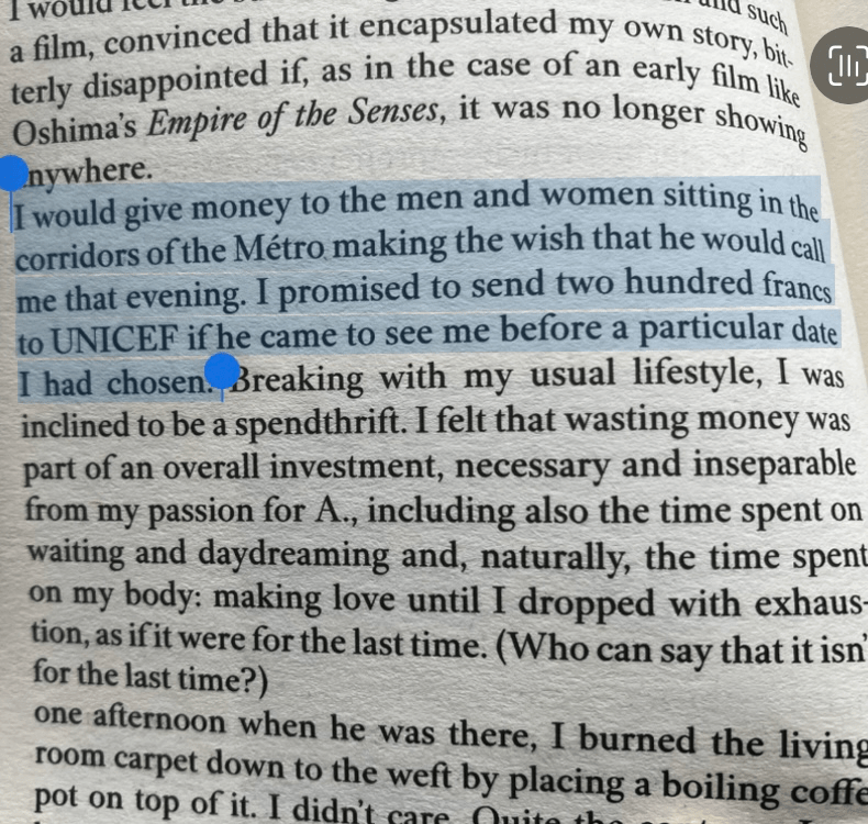 em paixão simples, a ausência como mais alta forma de presença é exemplificada nas promessas que Ernaux faz pra ela mesma no decorrer da sua rotina, ela dá dinheiro aos pedintes e faz desejos, ela espera que em troca o amante dela ligue. dias ou tarefas normais são amaldiçoadas pela ausência de alguém e te aproximam do divino; do mágico, da devoção.