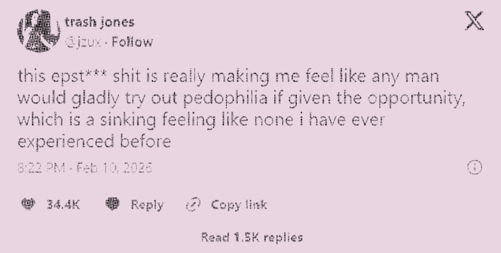 reconheci nas fotos uma qualidade específica de violência que se disfarça de algo prazeroso. eu já tinha visto aquelas imagens antes – o mesmo tipo de olhar sobre o mesmo tipo de corpo. o que era algo estranho e desconcertante numa conversa entre pré-adolescentes agora se revela como um documento criminal e como prova de um sistema. como prova de que nada daquilo era incomum, um desvio de um ou dois monstros. no último ano milhares de documentos foram liberados ou vazados por diferentes órgãos do governo dos eua, cada um parasitando o escândalo à sua maneira e nunca pela justiça das vítimas. em dezembro de 2025 o departamento de justiça publicou 30 mil páginas em nome de uma transparência que funciona basicamente como cortina de fumaça: mais de 550 delas completamente tarjadas em preto. entre o que sobreviveu, fotos de homens deitados sobre meninas, abraçados a meninas, com as mãos em seus corpos. homens sorrindo, confortáveis, todos à vontade com a segurança inabalável de quem sabe que está acima de qualquer lei.