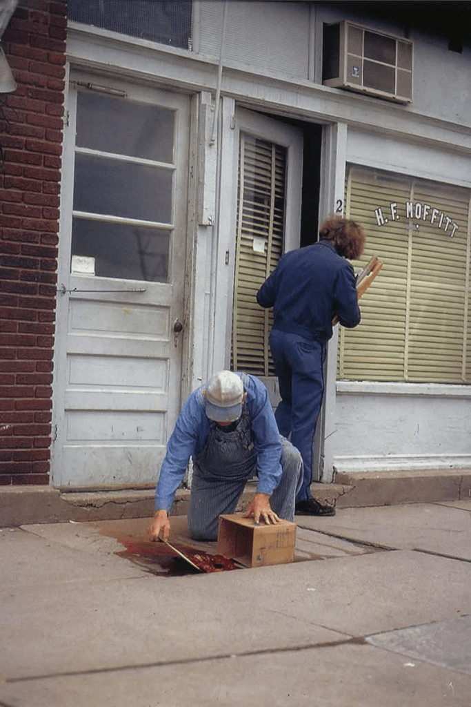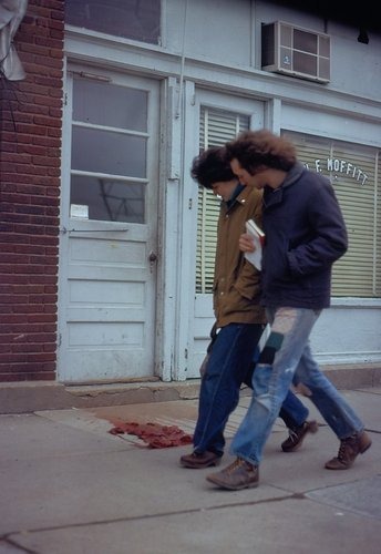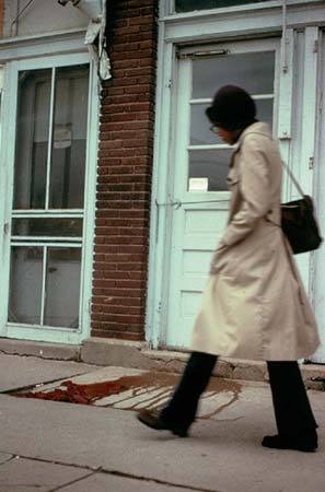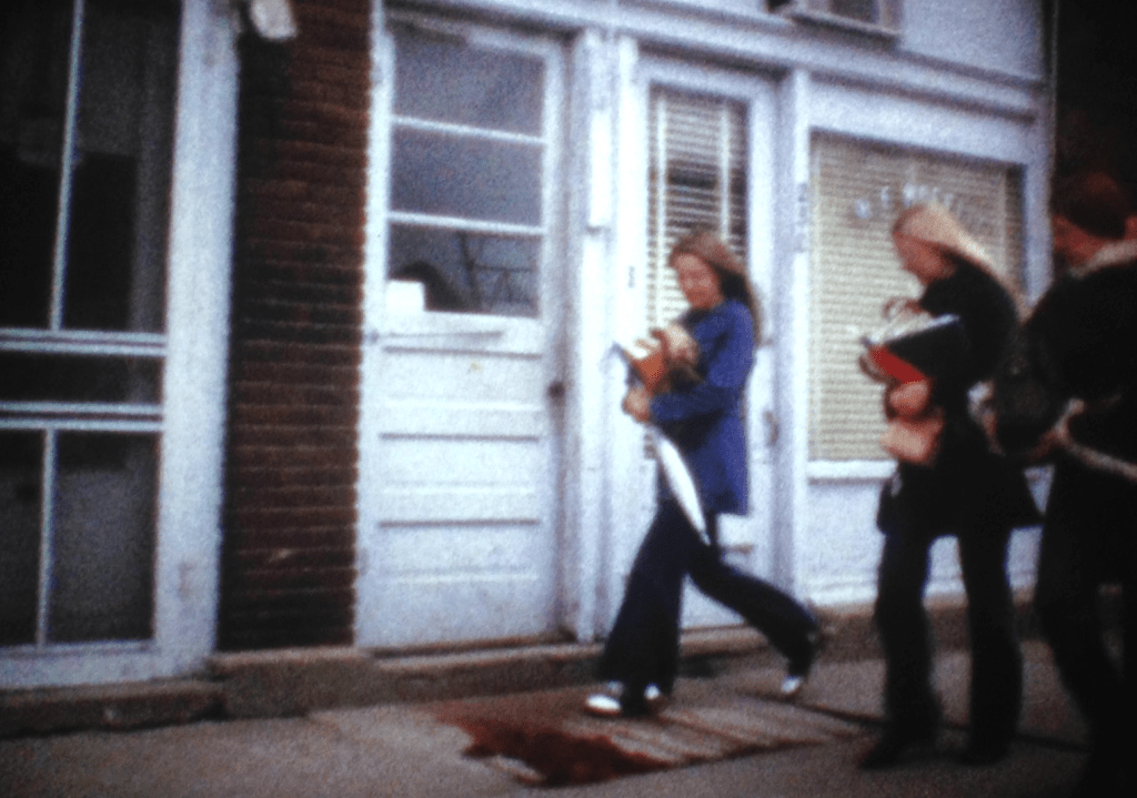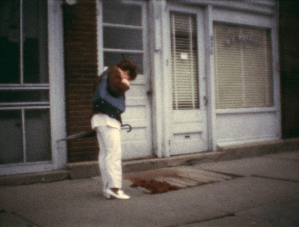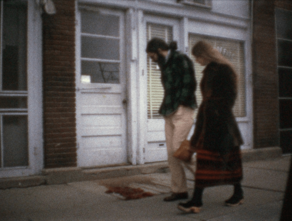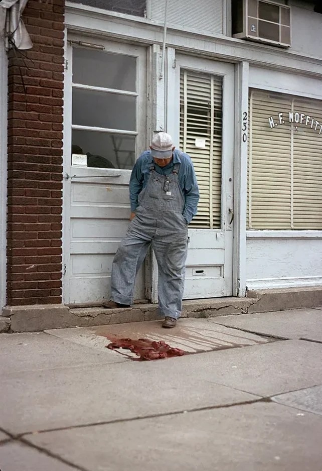 a série de slides se chama untitled (people looking at blood, moffitt, iowa) e o filme em super-8 que a acompanha, moffitt building piece. há sangue no chão da cidade e a pergunta não é quem fez isso, e sim por que ninguém faz nada?