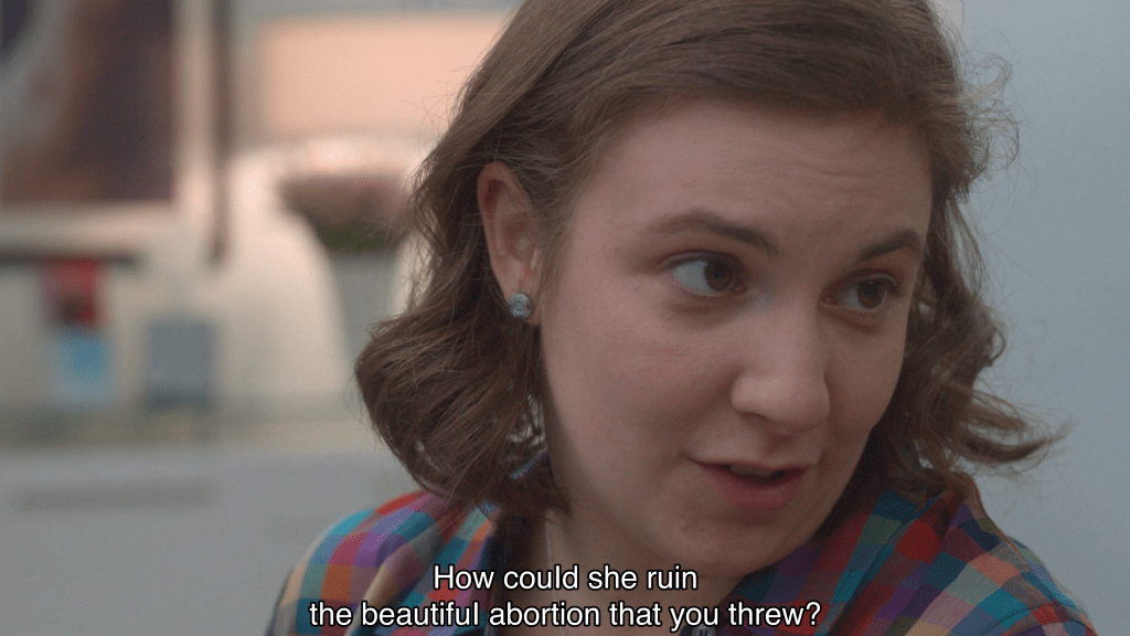 tem um episódio de girls, o segundo da série, “vagina panic”, em que a jessa acha que está grávida e decide abortar. e o que eu amo nesse episódio é que mesmo sem ter o melhor desenvolvimento no assunto, sem o melhor vocabulário (imagino que se fosse lançado hoje seria diferente), ele me mostrou uma realidade paralela em que eu poderia resolver minha questão com segurança, jogando conversa fora com as minhas amigas numa sala de espera. também que não existe a emoção certa, a reação adequada, o nível correto de sofrimento. e é muito engraçado porque no fim a jessa dá bolo nas meninas que estão esperando por ela na clínica e a marnie, que marcou a consulta, diz it’s a bummer because she ruined it. coisa de outro mundo mesmo.