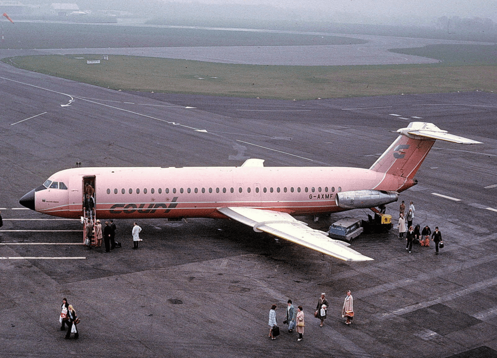 Topics: Court Line, BAC 1-11, Postcard, Newcastle Airport, bac 111, pink, aviation, avgeek, airplane, airplanes, plane, planes, ephemera