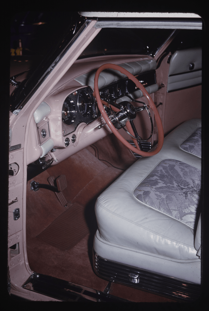 Interior of a pink Chrysler car at the Los Angeles Auto Show, vertical shot